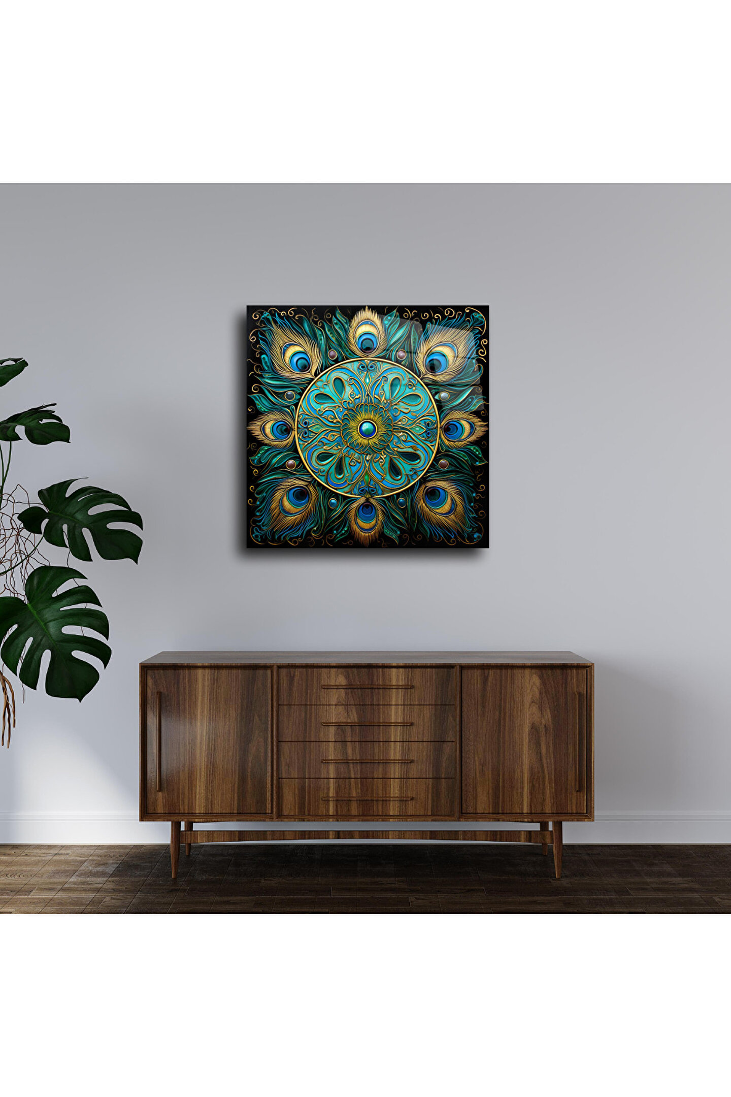 LEYLASER Tavus Kuşu Tüyü Mandala Cam Tablo Duvar Dekoru