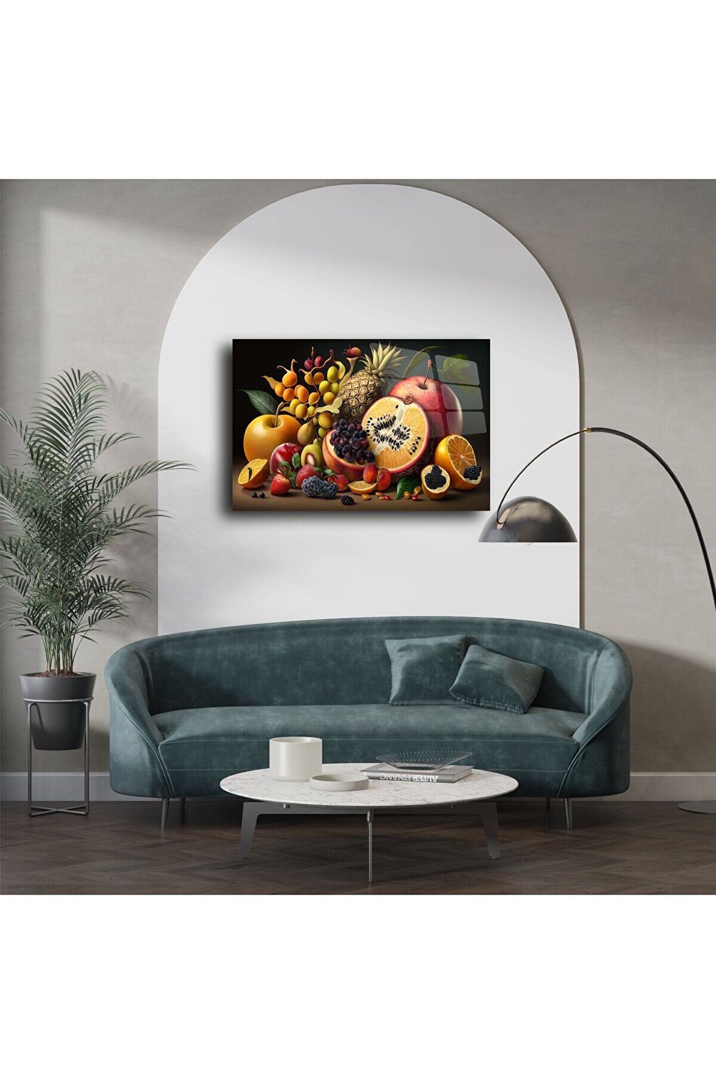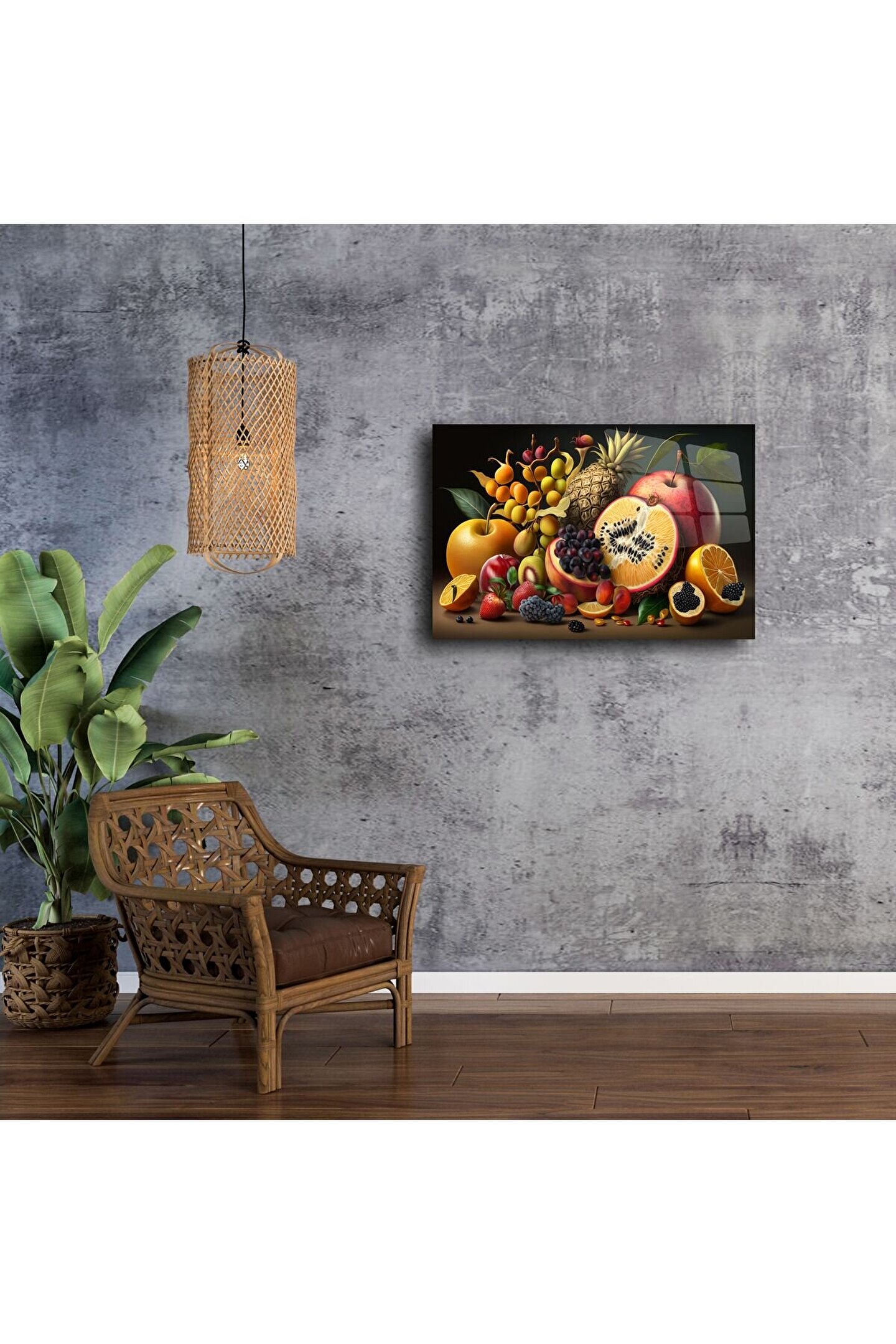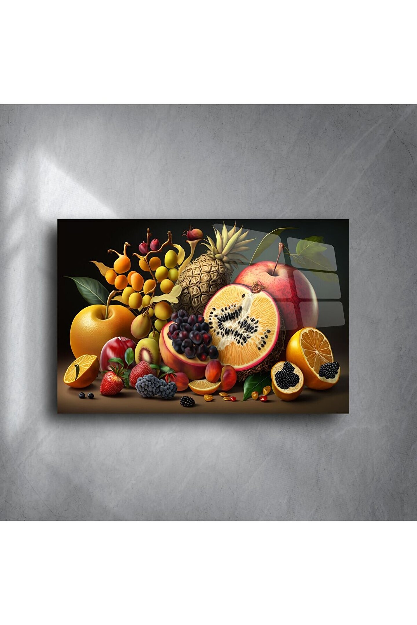 Enerjisiyle bulunduğu alanı canlandıran bu tropik meyve temalı cam tablo, doğanın canlılığını evinize taşır. Detaylı ve renkli kompozisyon, temperli cam yüzey üzerine yüksek çözünürlükte basılmıştır. Ananas, nar, üzüm, portakal ve daha pek çok tropik meyvenin yer aldığı tasarım; özellikle salon, mutfak ya da yazlık evler için mükemmel bir seçimdir.