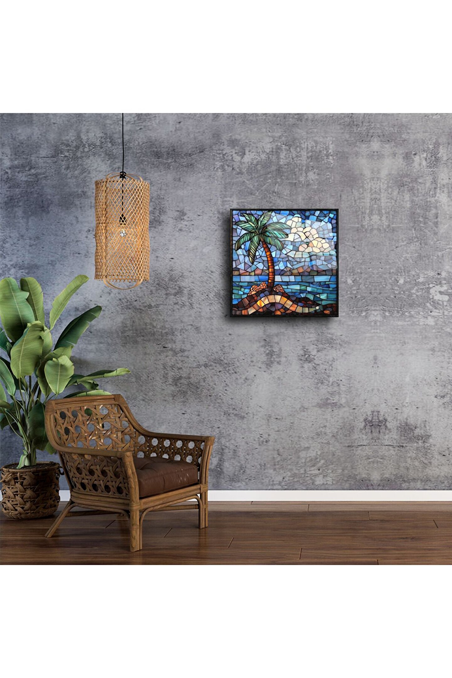 Bu göz alıcı tropikal palmiye ağaçlı cam tablo, yaz ruhunu ve sahil esintisini duvarlarınıza taşır. Vitray etkili renk geçişleri, okyanus mavisi ve doğal tonlarla birleşerek huzurlu bir atmosfer yaratır.