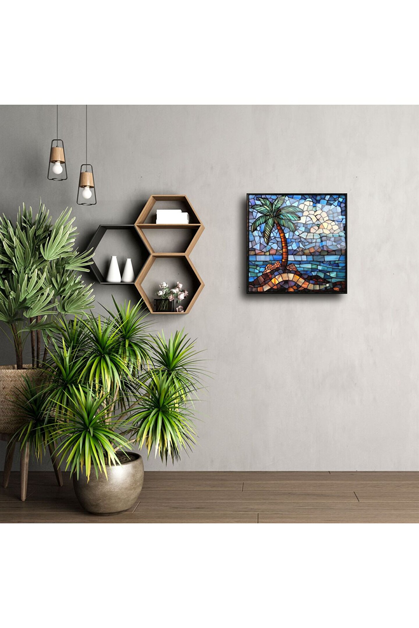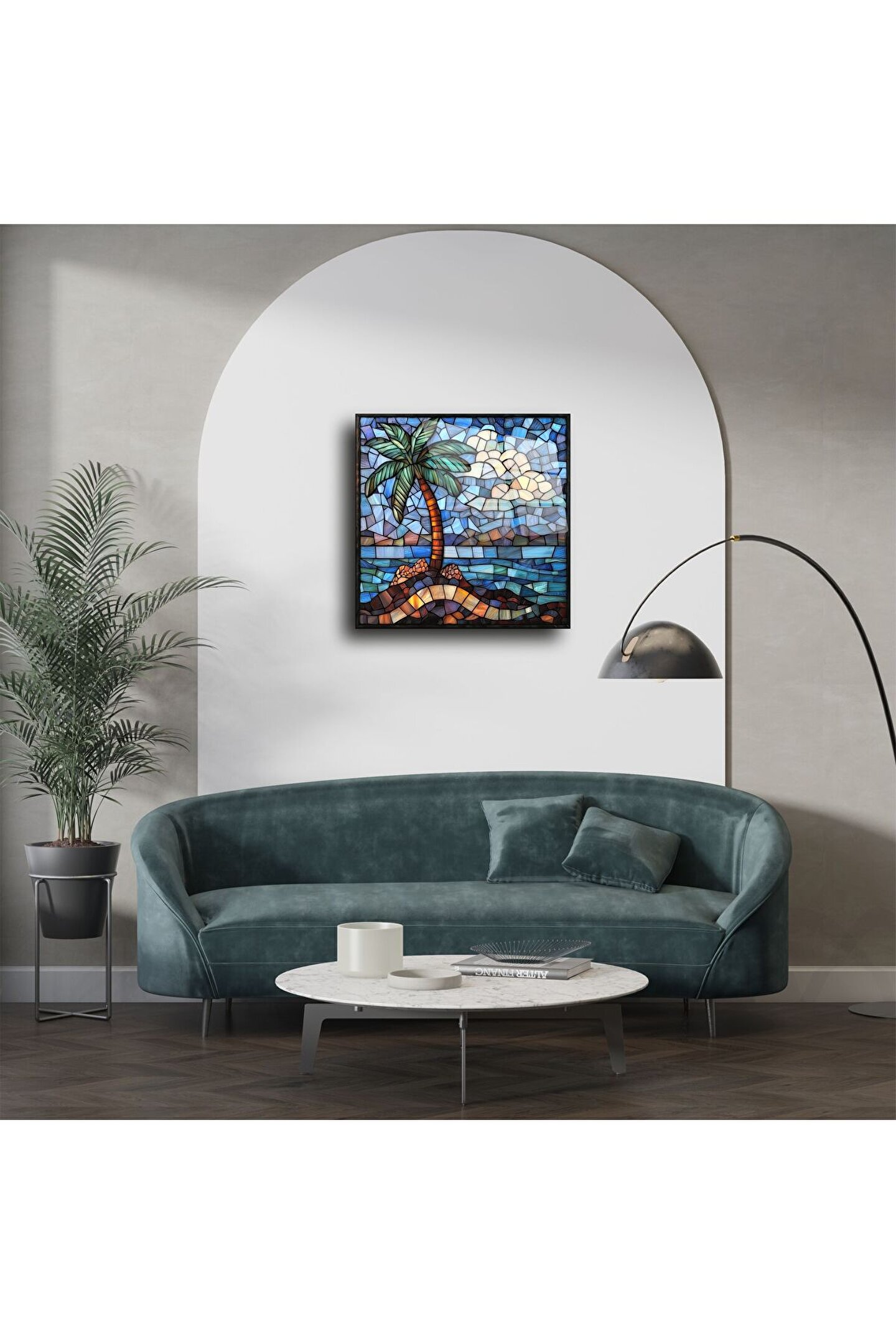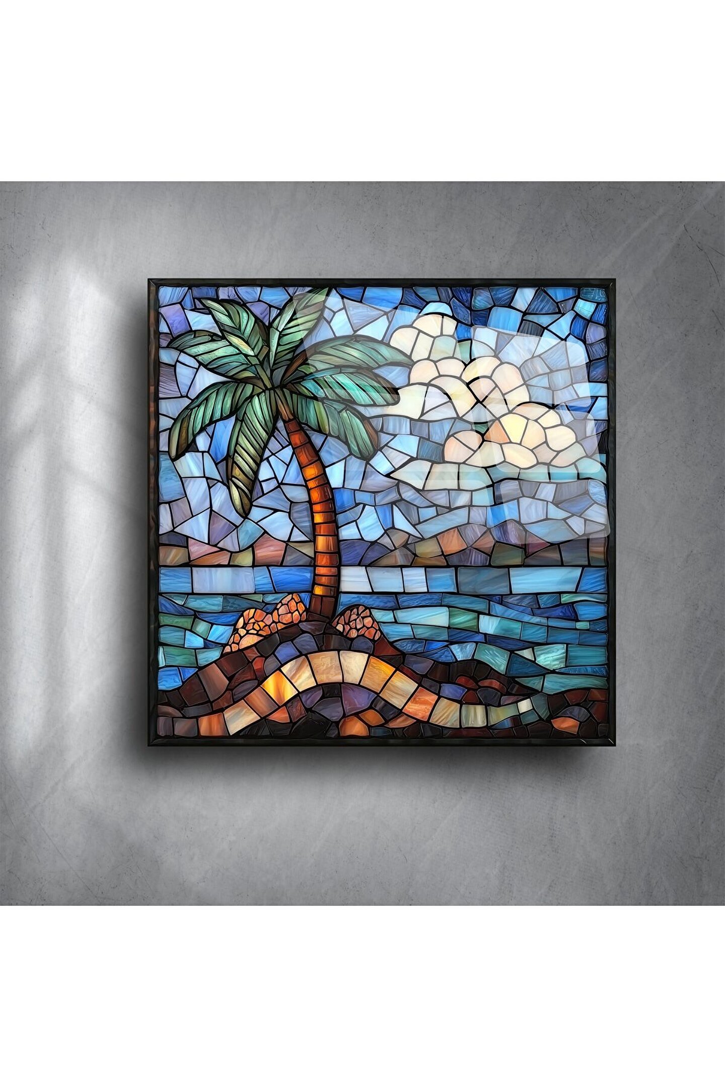 Bu göz alıcı tropikal palmiye ağaçlı cam tablo, yaz ruhunu ve sahil esintisini duvarlarınıza taşır. Vitray etkili renk geçişleri, okyanus mavisi ve doğal tonlarla birleşerek huzurlu bir atmosfer yaratır.