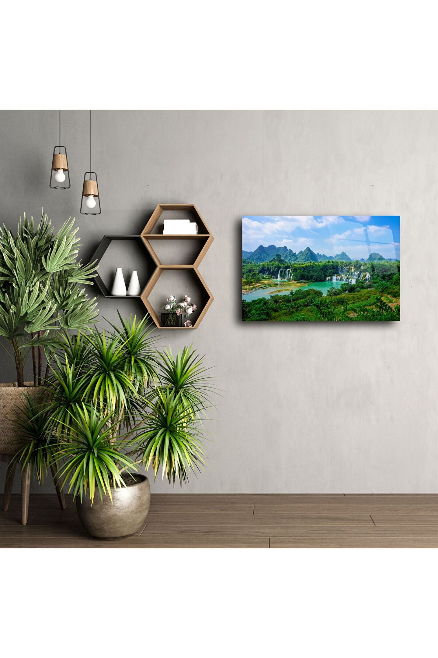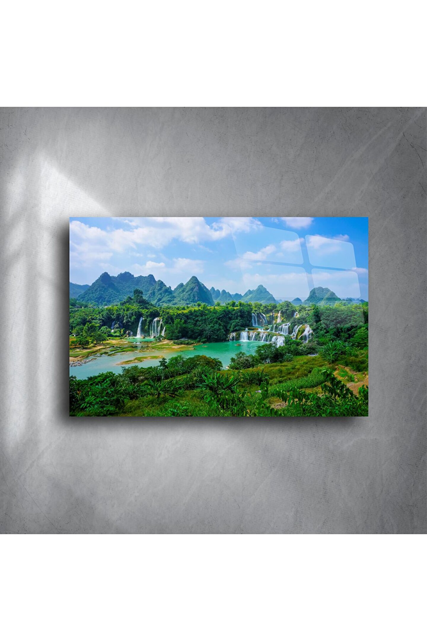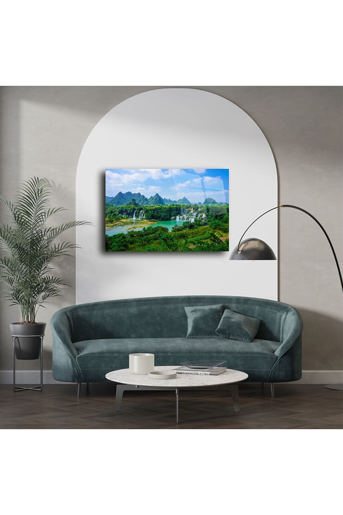 Doğanın en huzur verici haliyle buluşun: Şelalelerin coşkusu, yemyeşil doğa ve masmavi gökyüzü bu muhteşem cam tabloda hayat buluyor. Tropikal doğa manzarasını evinizin ya da ofisinizin duvarına taşıyan bu tasarım, canlı renkleri ve detaylı baskısıyla büyüleyici bir atmosfer sunar.