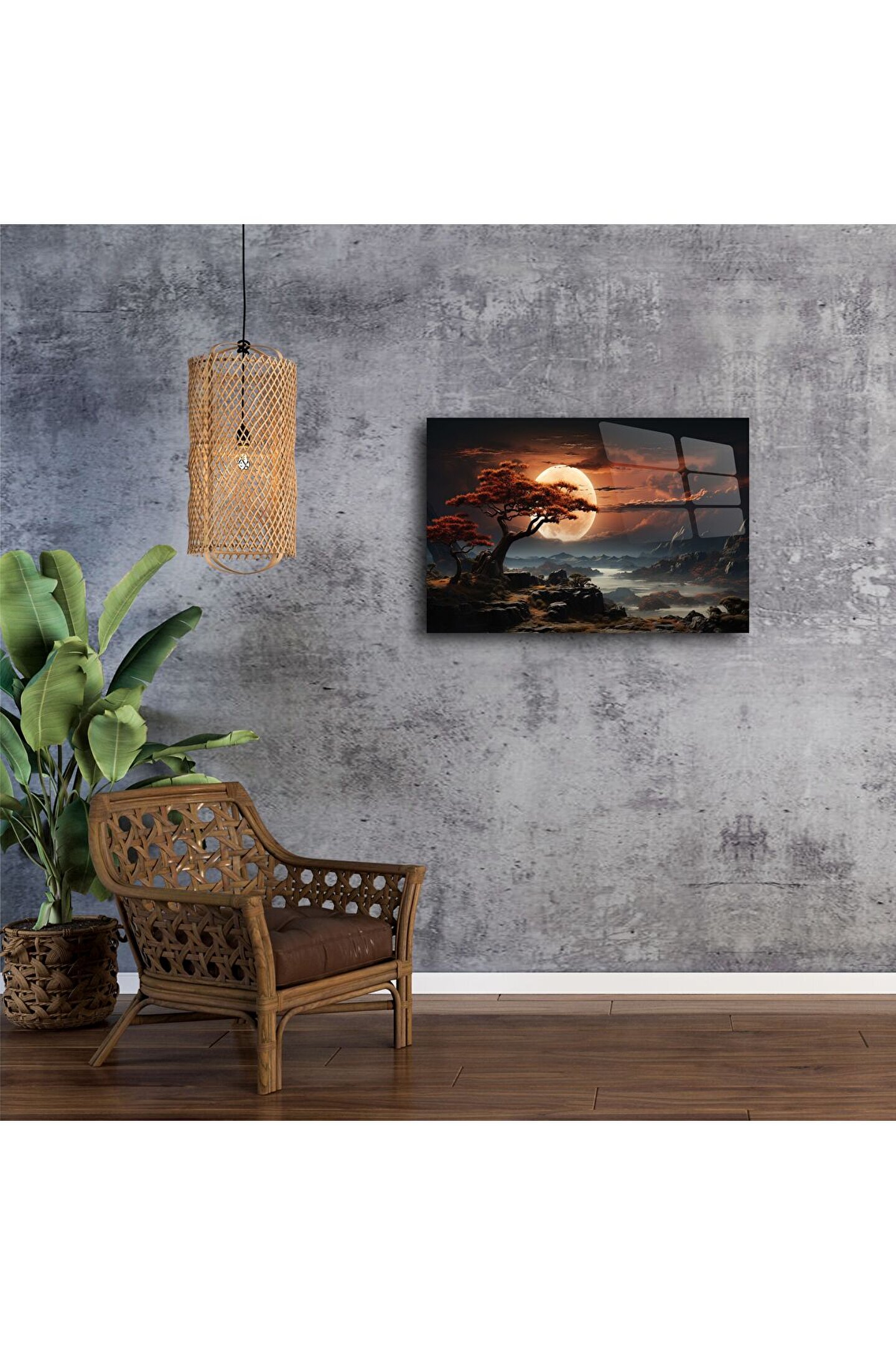 Büyüleyici turuncu ay ışığı altında kıvrılan siluet ağaçları ve sisli dağ manzarasıyla bu cam tablo, doğaya duyduğunuz tutkuyu duvarlarınıza taşıyor. Yüksek çözünürlüklü baskı teknolojisi ile üretilen bu modern duvar sanatı, ışığı yansıtan parlak cam yüzeyiyle odanıza sofistike bir atmosfer katıyor.