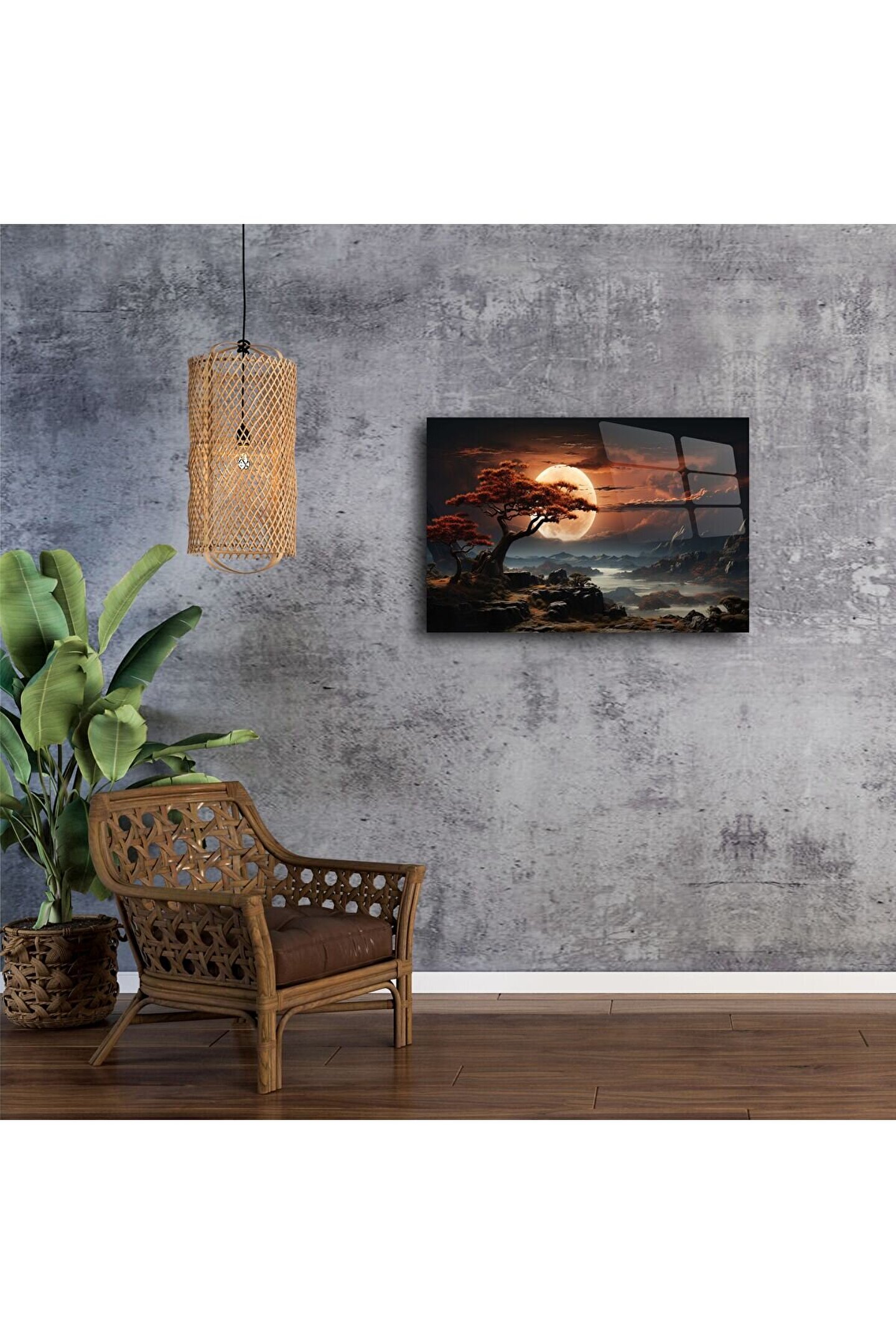 LEYLASER Turuncu Ay Manzaralı Ağaçlı Cam Tablo