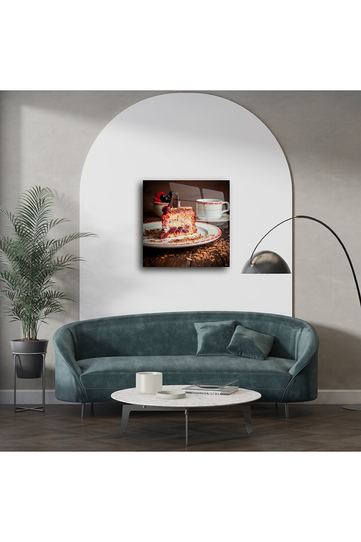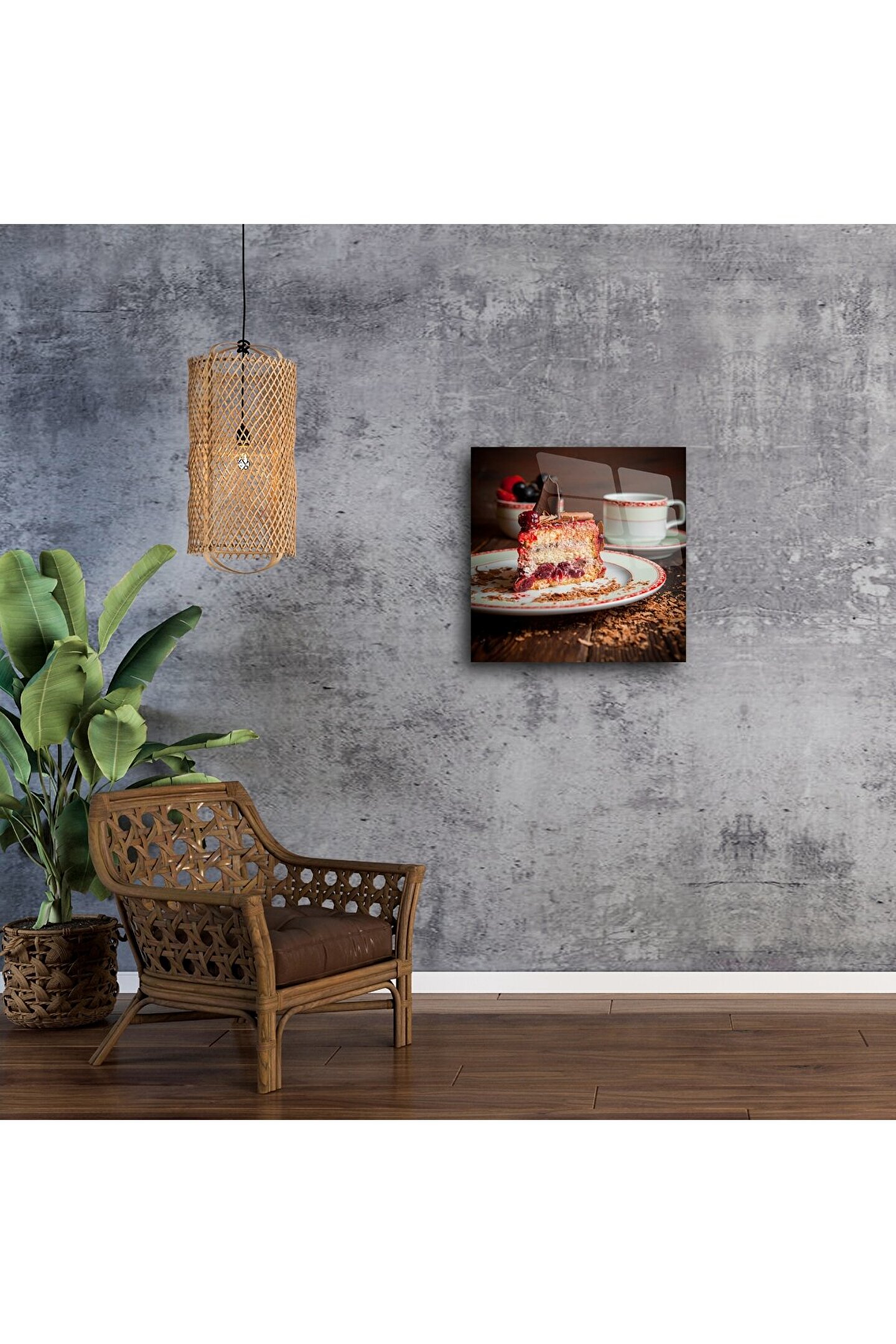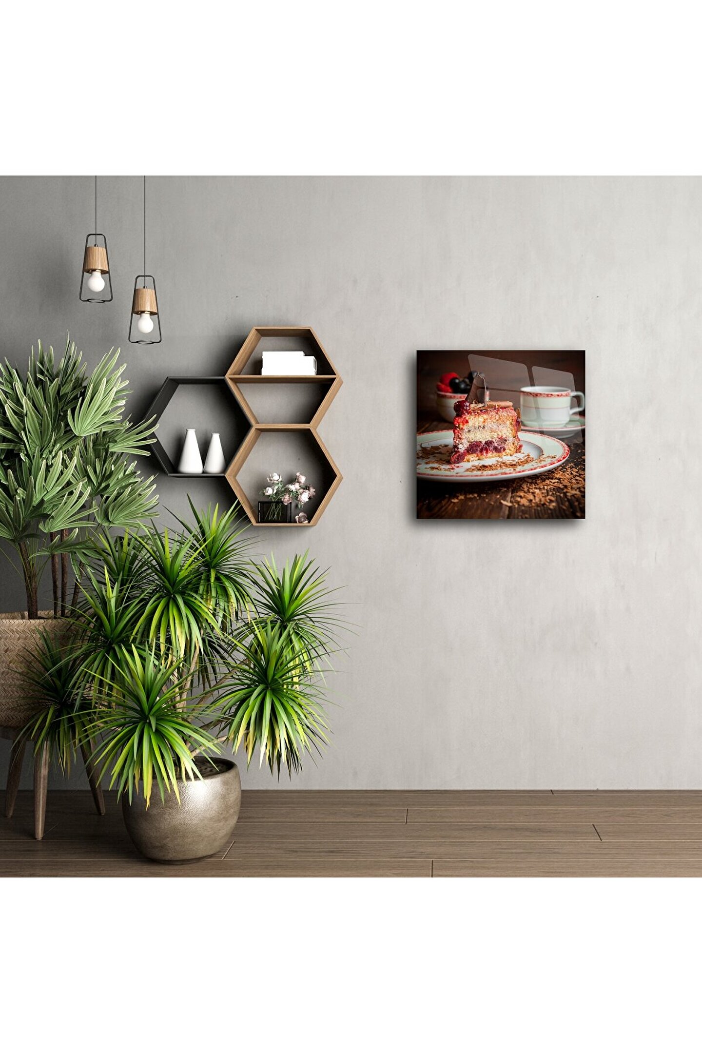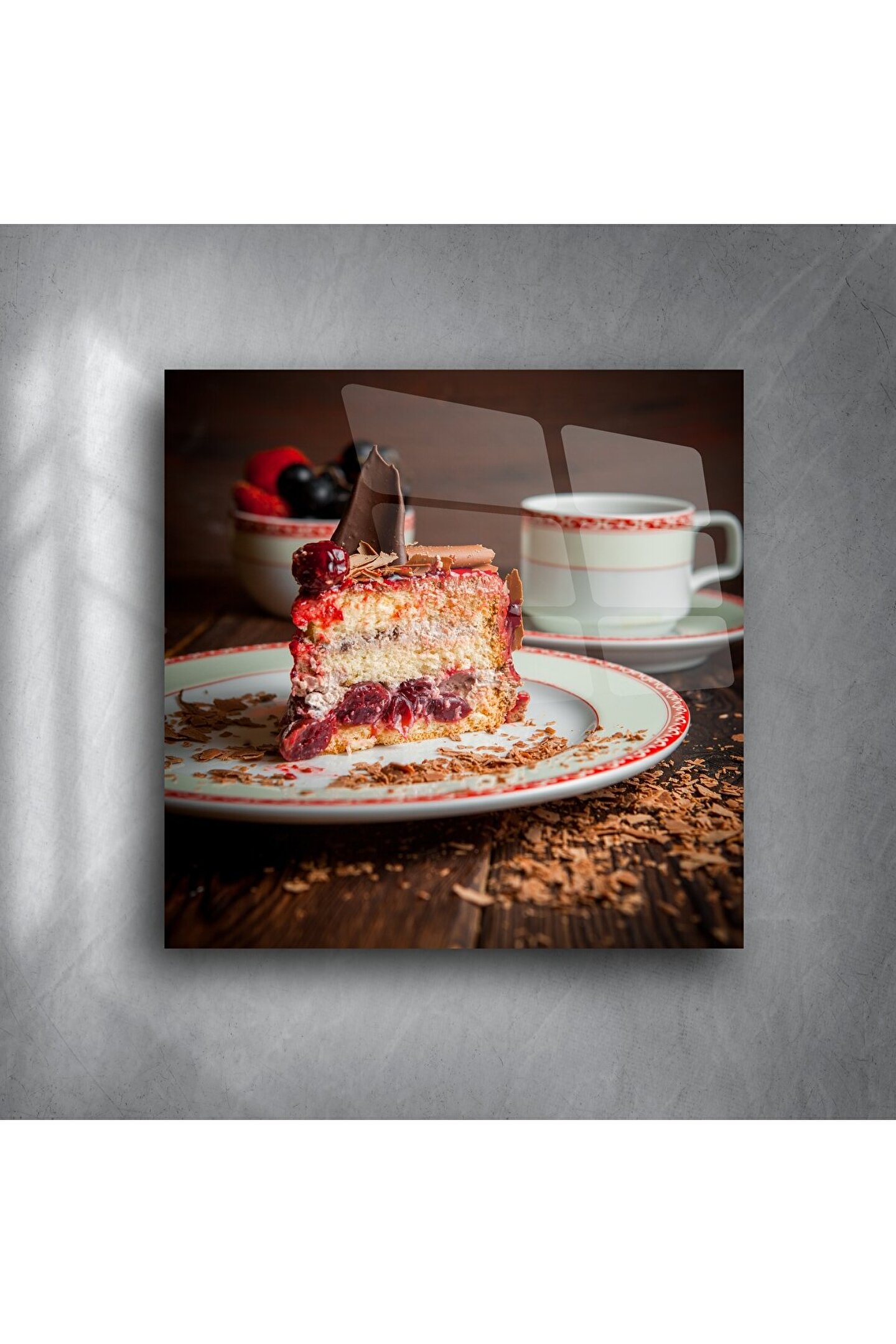Bu Rustik Cam Duvar Tablosu, vişneli, kremalı ve çikolatalı pastayı enfes bir detayla sunarak mutfağınıza ya da kahve köşenize nostaljik bir sıcaklık katar. Ahşap tonlarında fon, zarif kahve fincanı ve canlı kırmızı meyvelerle tamamlanan bu sahne, sofraların ruhunu yansıtan otantik bir atmosfer oluşturur.