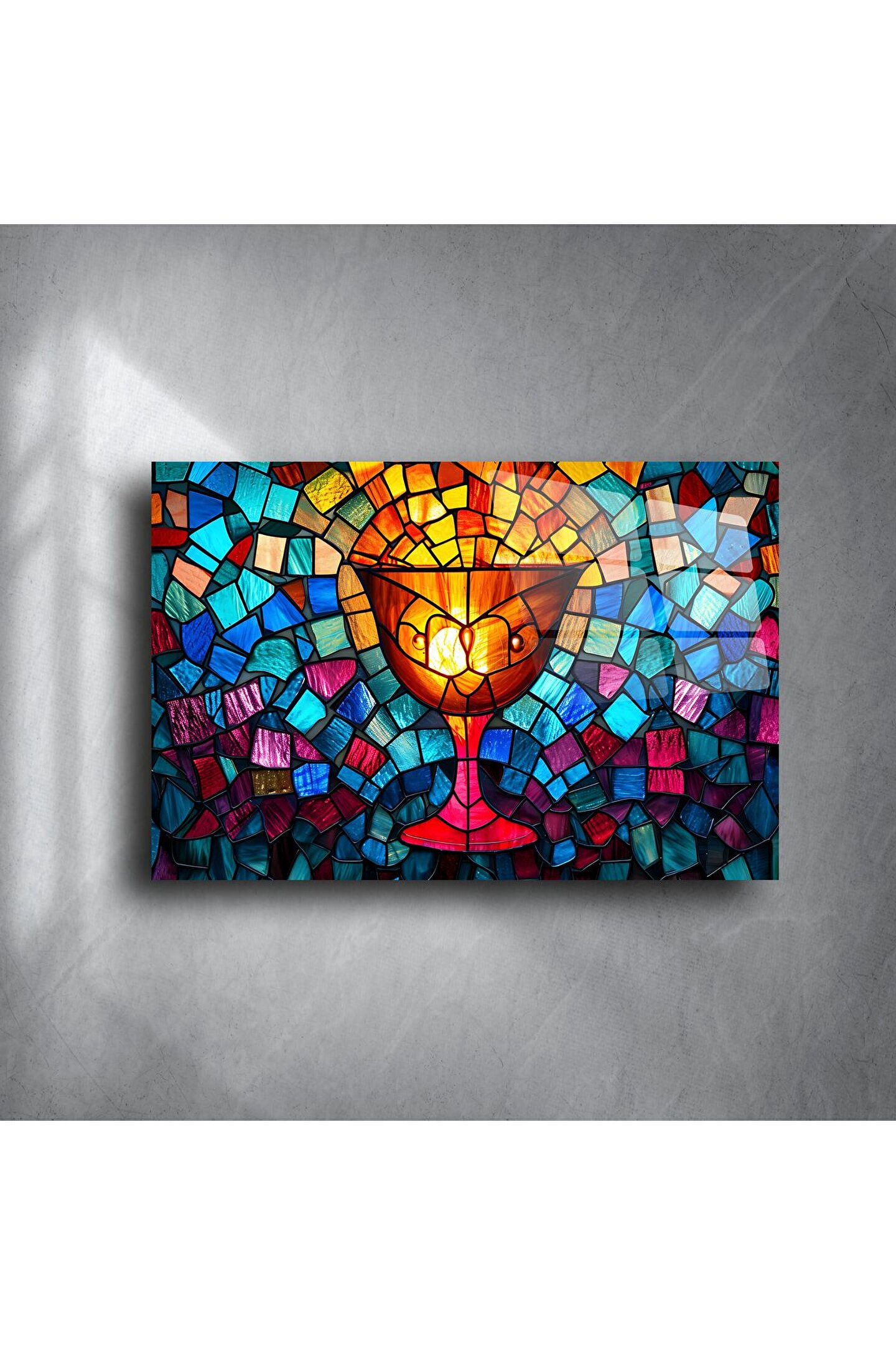 Bu zarif vitray kadeh duvar sanatıyla kutsal gelenekleri onurlandırın — canlı mavi, kırmızı ve altın tonlarında işlenmiş bir inanç ve adanmışlık sembolü. El işçiliğiyle üretilmiş mozaik tasarımı huzur ve maneviyat hissi uyandırır; her odaya spiritüel bir odak noktası kazandırmak için idealdir.