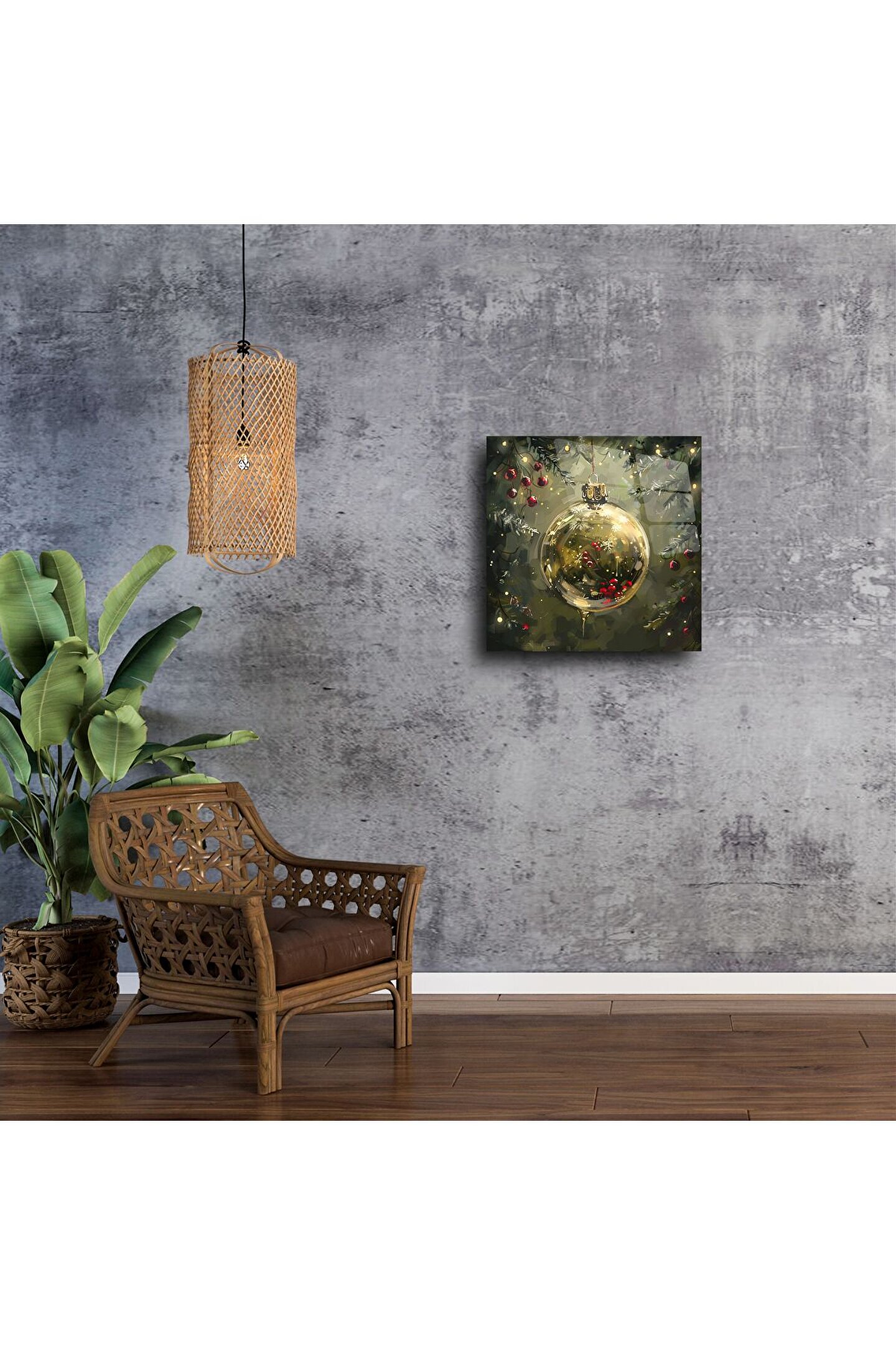 LEYLASER Yılbaşı Temalı Işıltılı Altın Cam Süslemeli Çam Dalı Desenli Dekoratif Cam Tablo