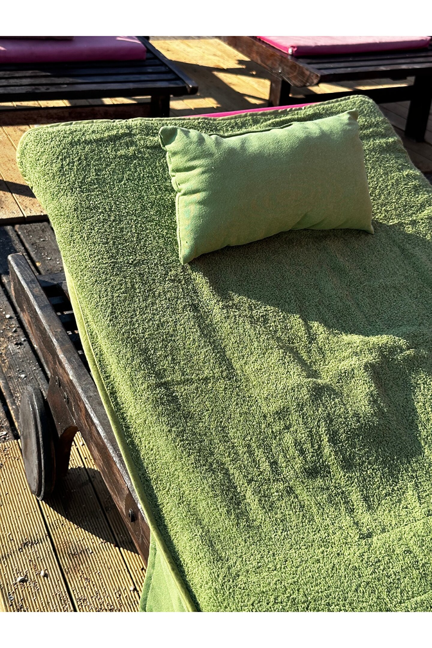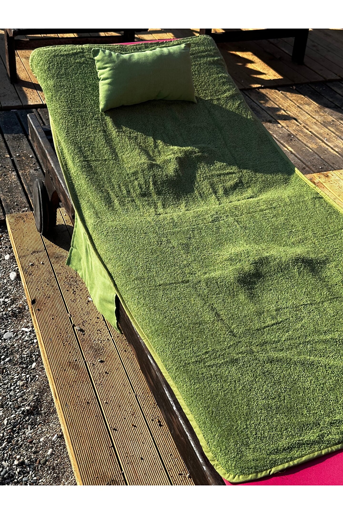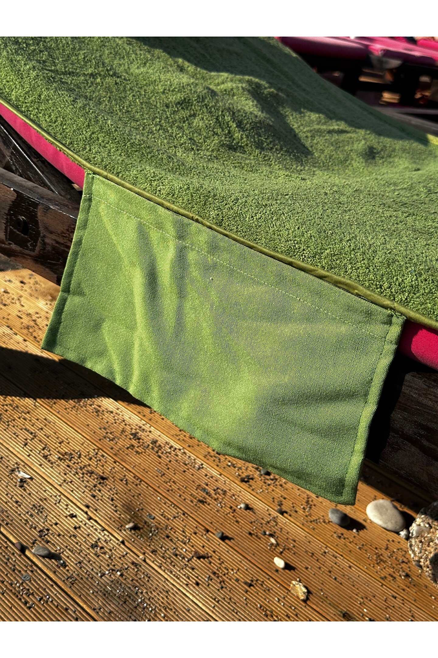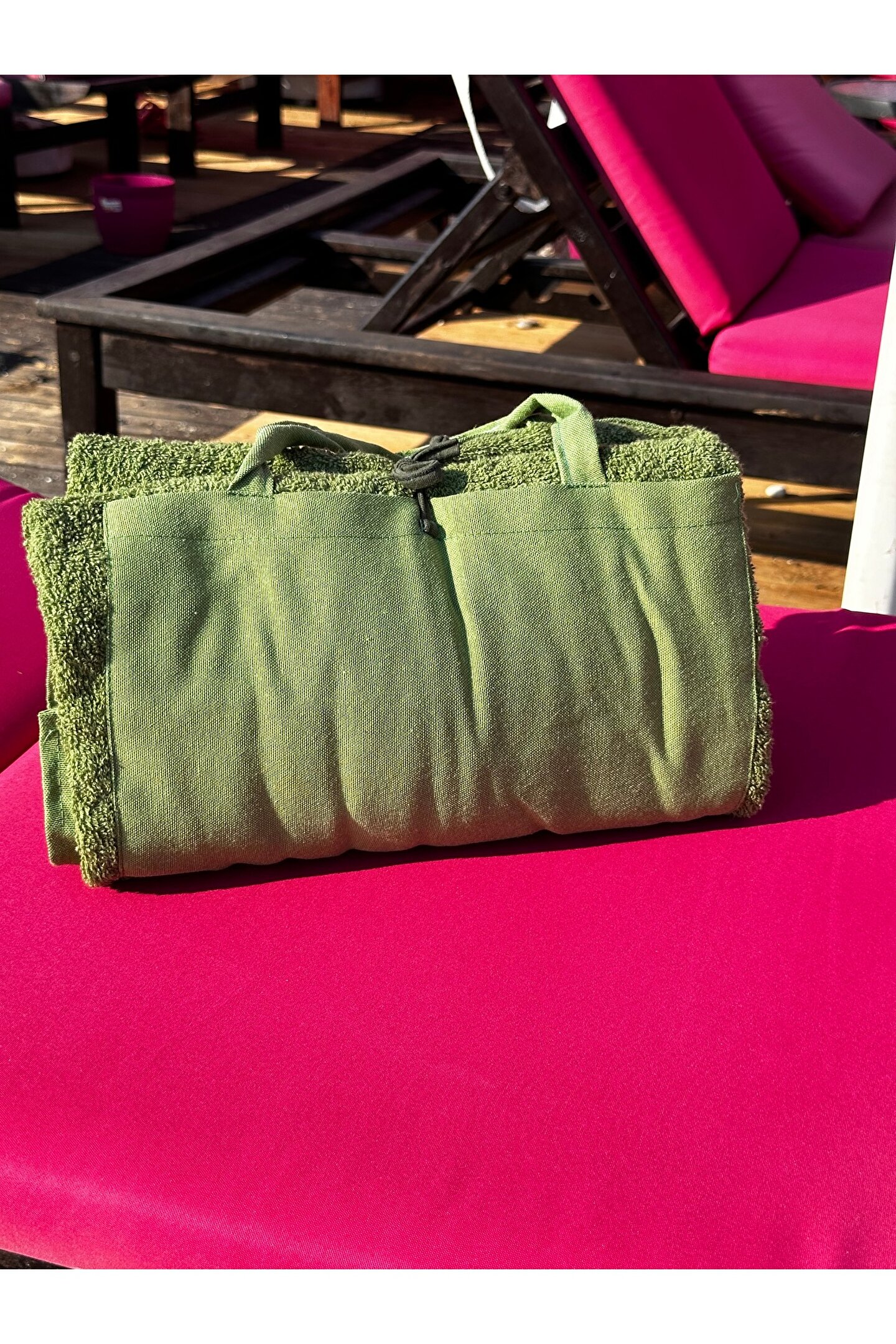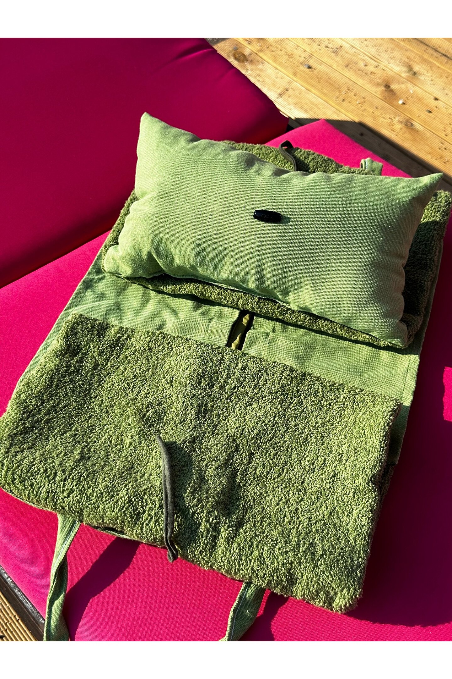 Çanta formunda plaj havlusu Ürün içerisinde yastığı ile gönderilmektedir. ; Ürünün çanta formunda iken 4, açık formda iken de 4 cebi bulunmaktadır. ; Ceplerde cüzdan, telefon, anahtar, kitap gibi bütün özel eşyalarınızı rahatlıkla muhafaza edebilirsiniz. ; Şezlonga sabitlemek için ipi bulunmaktadır. ; Aynı zamanda içinden çıkan yastık rüzgardan uçmaması ve kolay kullanım için istendiğinde düğme ile sabitlenebilmektedir. ; Çamaşır makinasında yıkamaya uygundur. ; Ürün üzerindeki çanta detayı dikme formdadır. ; Ürün açılıp şezlonga serildiğinde çanta detayı altta kalıp kolay kullanım sağlar. ; 75x150 cm;
