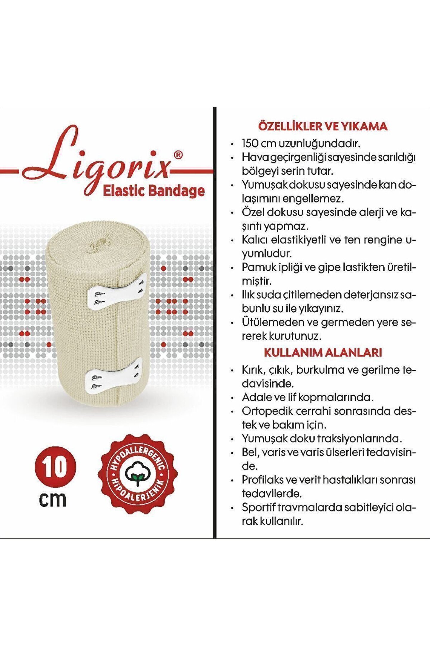 Özellikler 150 cm uzunluğundadır ; Haa geçirgenliği sayesinde sarıldığı bölgeyi serin tutar ; Yumuşak dokusu sayesinde kan dolaşımını engellemez ; Özel dokusu sayesinde alerji ve kaşıntı yapmaz ; Kalıcı elastikiyetli ve ten rengine uyumludur ; Pamuk ipliği ve gipe lastikten üretilmiştir ; Ilık suda çitilemeden deterjansız sabunlu su ile yıkayınız ; Ütülemeden ve germeden yere sererek kurutunuz ;
