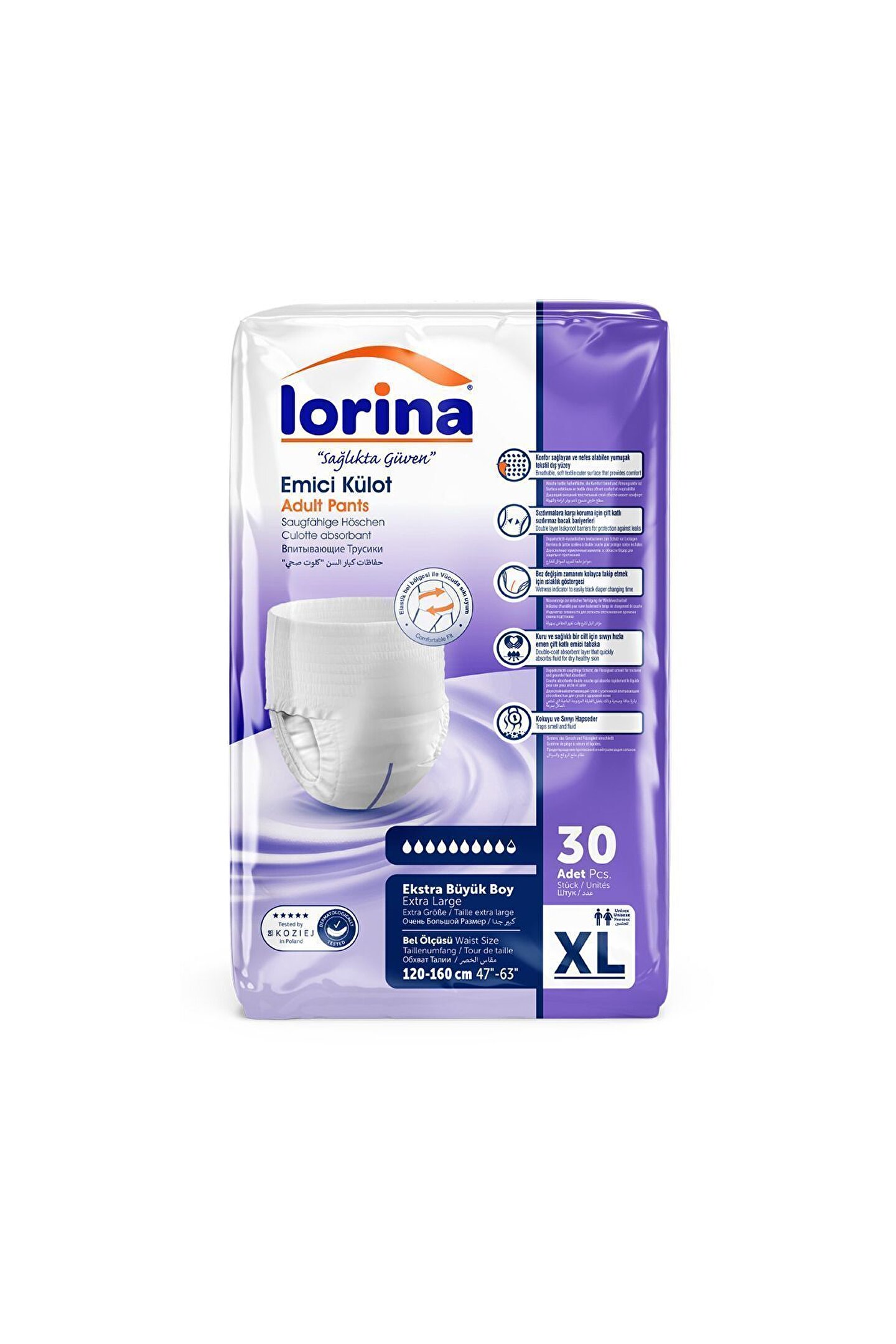 - Geniş beden seçeneği ile her kullanıcıya uygun konfor sunar.; - 30 adetlik paketi sayesinde uzun süreli kullanım imkanı sağlar.; - Yerli üretim olup, kalite standartlarına uygun olarak üretilmiştir.; - Emici özelliğiyle hijyenik bir ortam korurken rahatlık sunar.