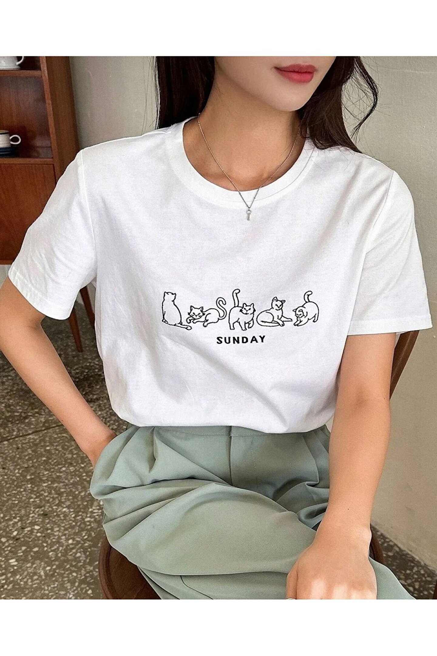 Kadın Beyaz Sunday Kedi Baskılı Bisiklet Yaka Oversize Tişört