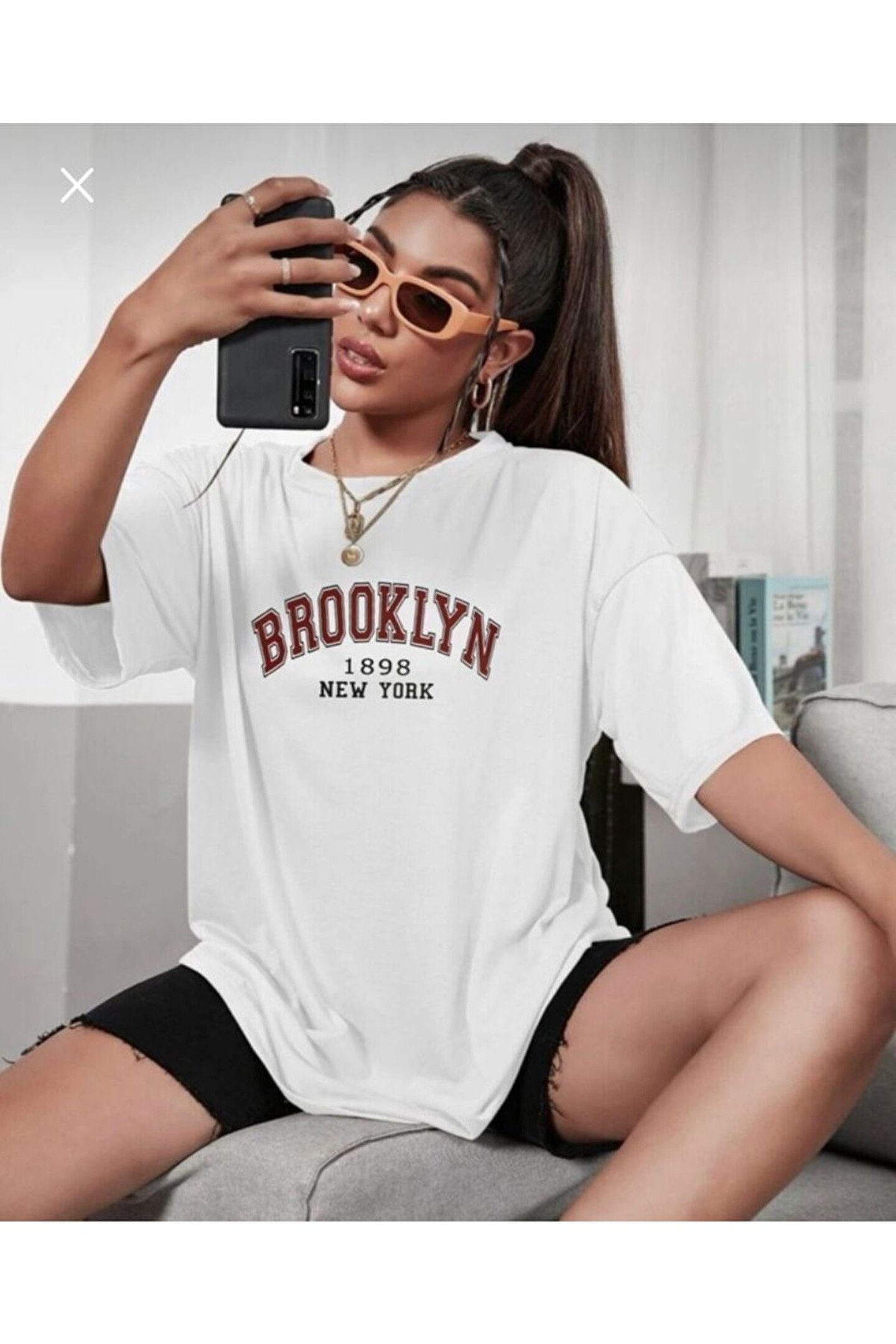 Unisex Oversize Kırmızı Broklyn Beyaz Tshirt