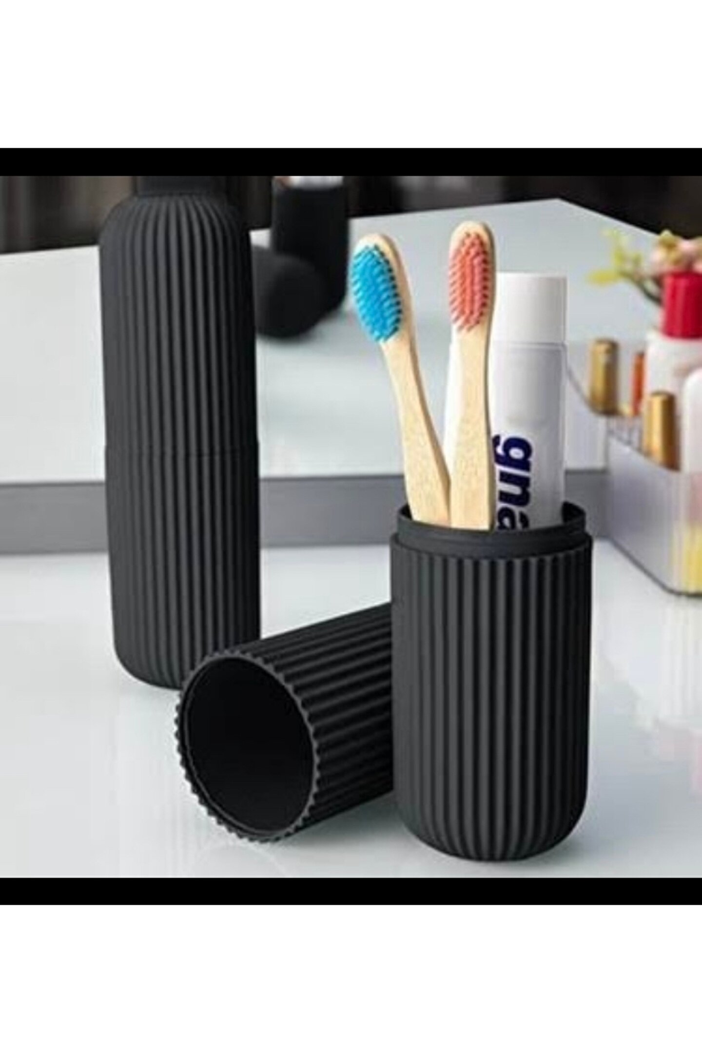 Üç adet seyahat diş fırçası ve gözlük kabını düzenli tutmak için idealdir.; Banyoda kolayca kullanılabilen pratik ve şık tasarımıyla dikkat çeker.; Dayanıklı plastik materyali sayesinde uzun süreli kullanım imkanı sunar.; Siyah, beyaz ve gri renk seçenekleriyle banyonuzun dekorasyonuna uyum sağlar.;