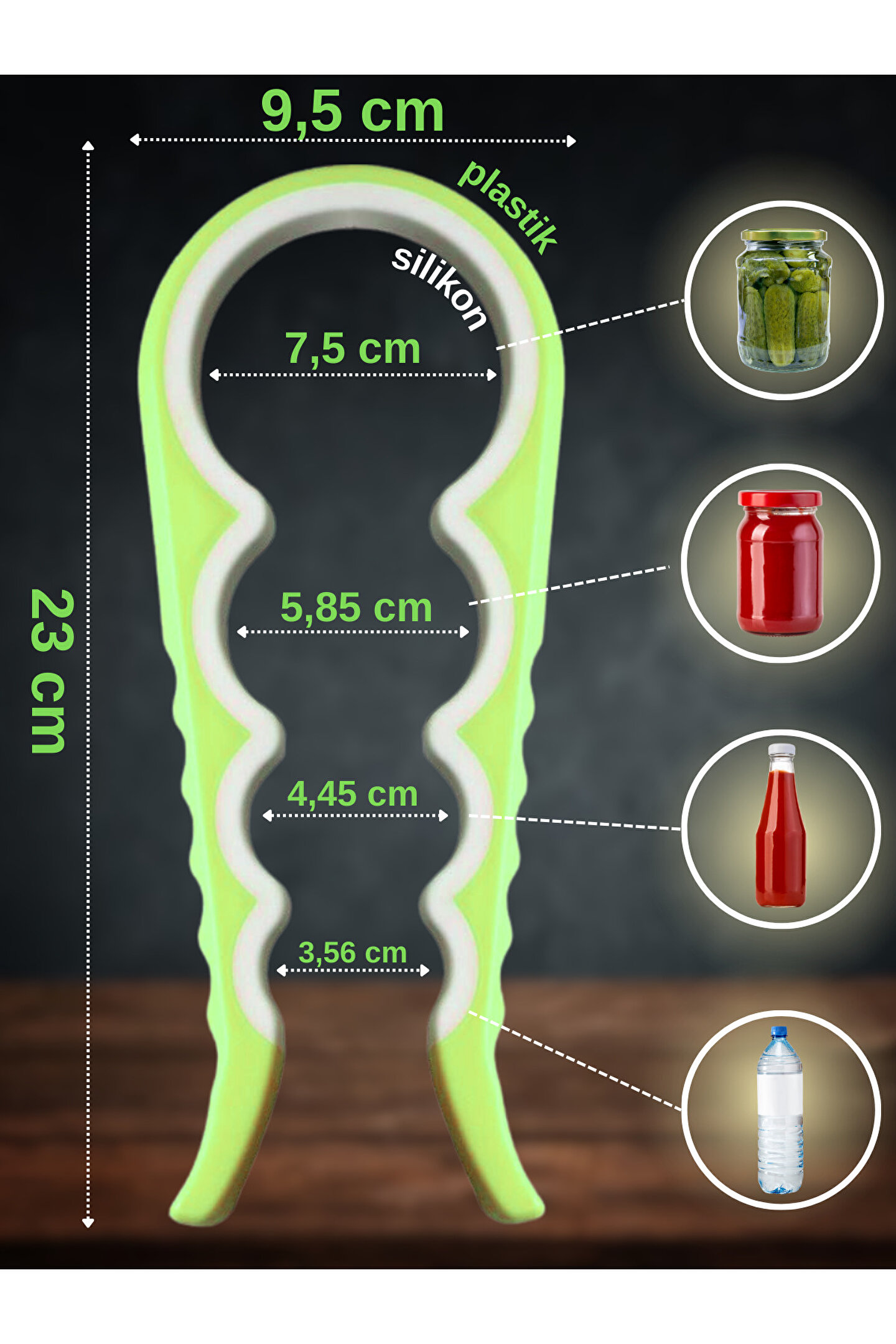 Evrensel kavanoz ve şişe açacağı: Her harekette kolaylık ve rahatlık Günlük hayatta karşımıza çıkan küçük ancak can sıkıcı problemlerden biri, sıkıca kapanmış bir kavanoz veya şişeyi açmaktır. ; Işte bu yüzden, mutfak rutininizi kolaylaştırmak için evrensel kavanoz ve şişe açacağımızı tasarladık. ; Açacağımızın özellikleri: Malzeme: Dış kısım dayanıklı plastikten, iç kısım ise kaymayı önleyen silikondan yapılmıştır. ; Boyut: 23 cm uzunluğunda, kapaklar için 7,5 cm, 5,85 cm, 4,45 cm, 3,56 cm çapında deliklere sahip, bu sayede çeşitli kavanoz ve şişe türleri için evrensel bir çözüm sunar. ; Tasarım: Açacağımız pembe, sarı, yeşil ve mavi olmak üzere dört renkte mevcut, bu da mutfak dekorunuza uygun olanı seçmenize olanak tanır. ; Açacağımızın avantajları: Evrensellik: Konserve sebzeler, reçel kavanozları, soslar için cam şişeler veya içecekler için plastik şişeler gibi çoğu kavanoz ve şişe türüne uygun. ; Konfor ve güvenlik: Yumuşak silikon kaymayı önler, kullanım sırasında güvenlik ve etkinliği artırır. ; Bakım ve saklama kolaylığı: Kolay temizlenmesi ve saklanması, bu açacağı her mutfak için ideal bir eklenti yapar. ; Bu açacağınız, kavanoz ve şişe açma işlemini güvenli, rahat ve hızlı hale getirerek mutfak işlerinizde güvenilir bir yardımcınız olacak. ; Evrensel açacağımızın konforu ve güzelliği ile kendinizi ve sevdiklerinizi şımartın!;