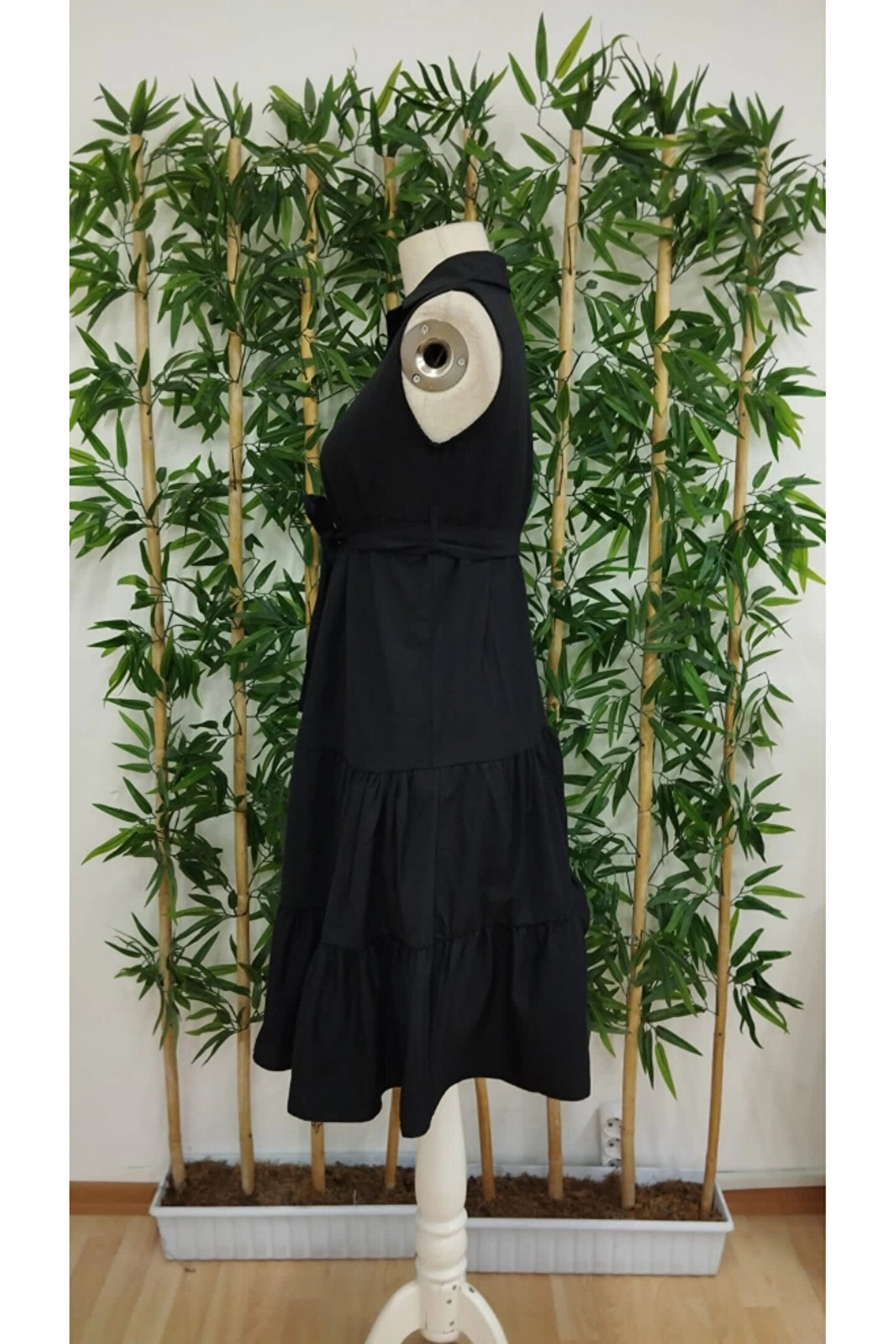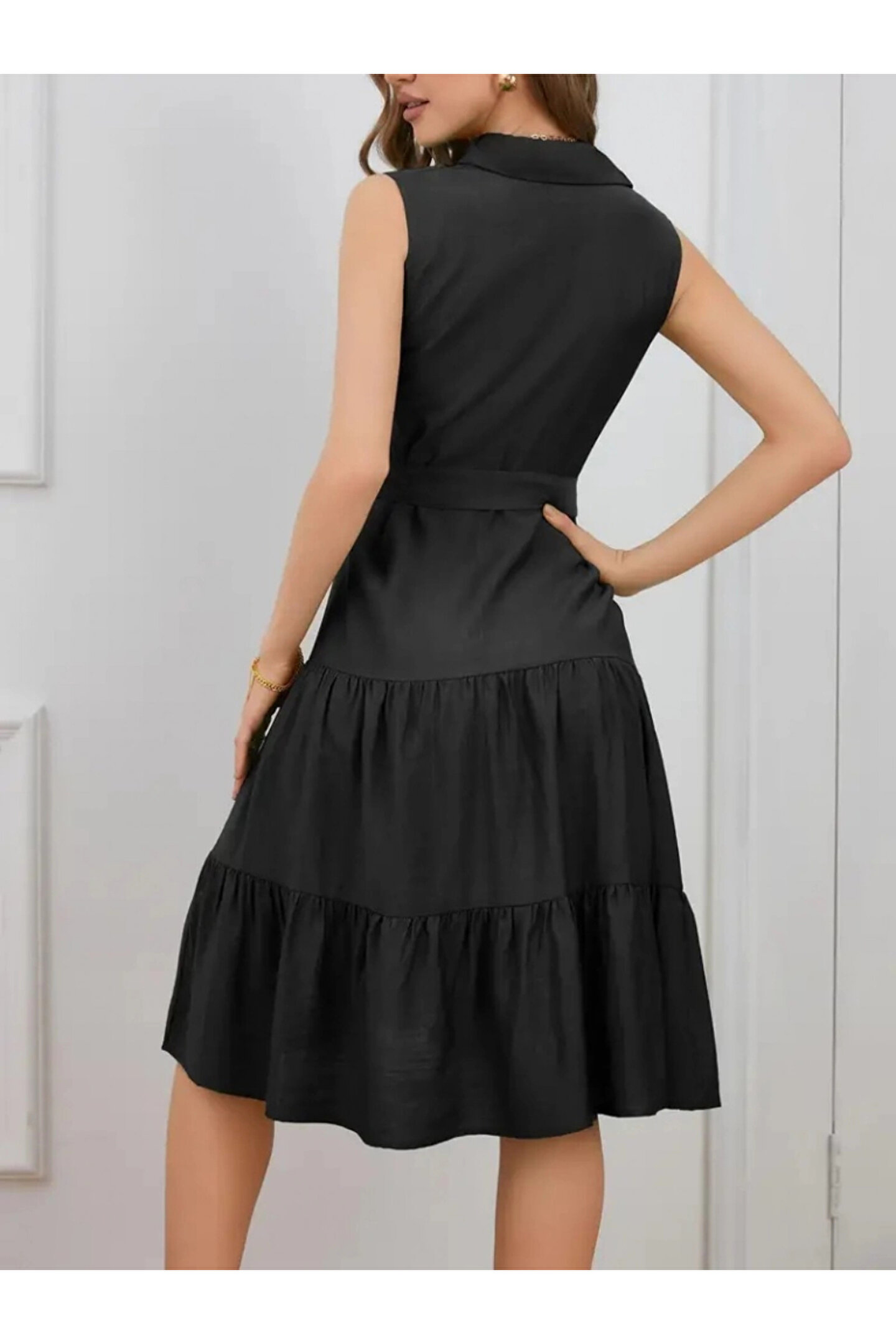 Kadın Kısa Kollu Gömlek Yaka Düğmeli Beli Kuşaklı Katlı Dokuma Midi Elbise