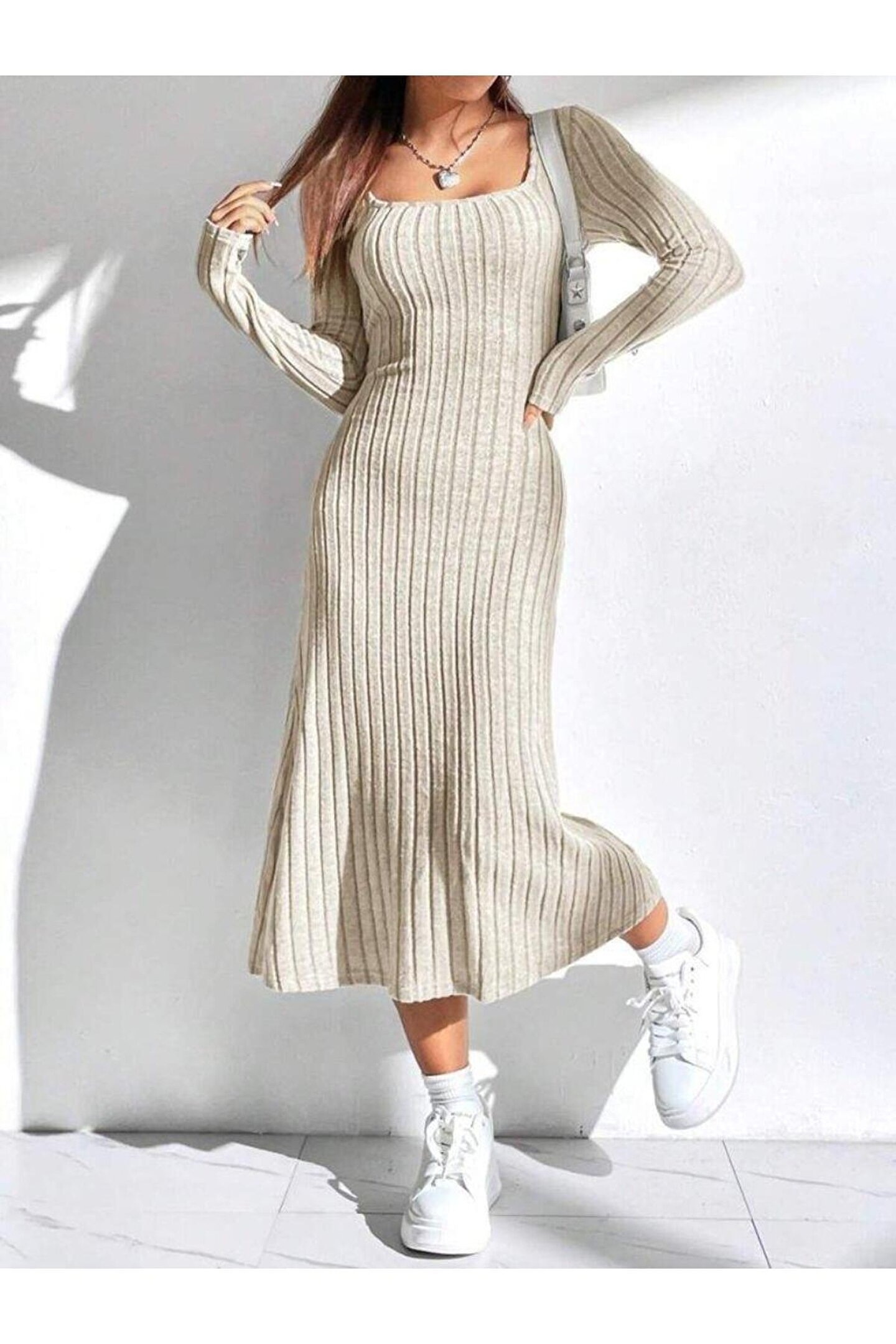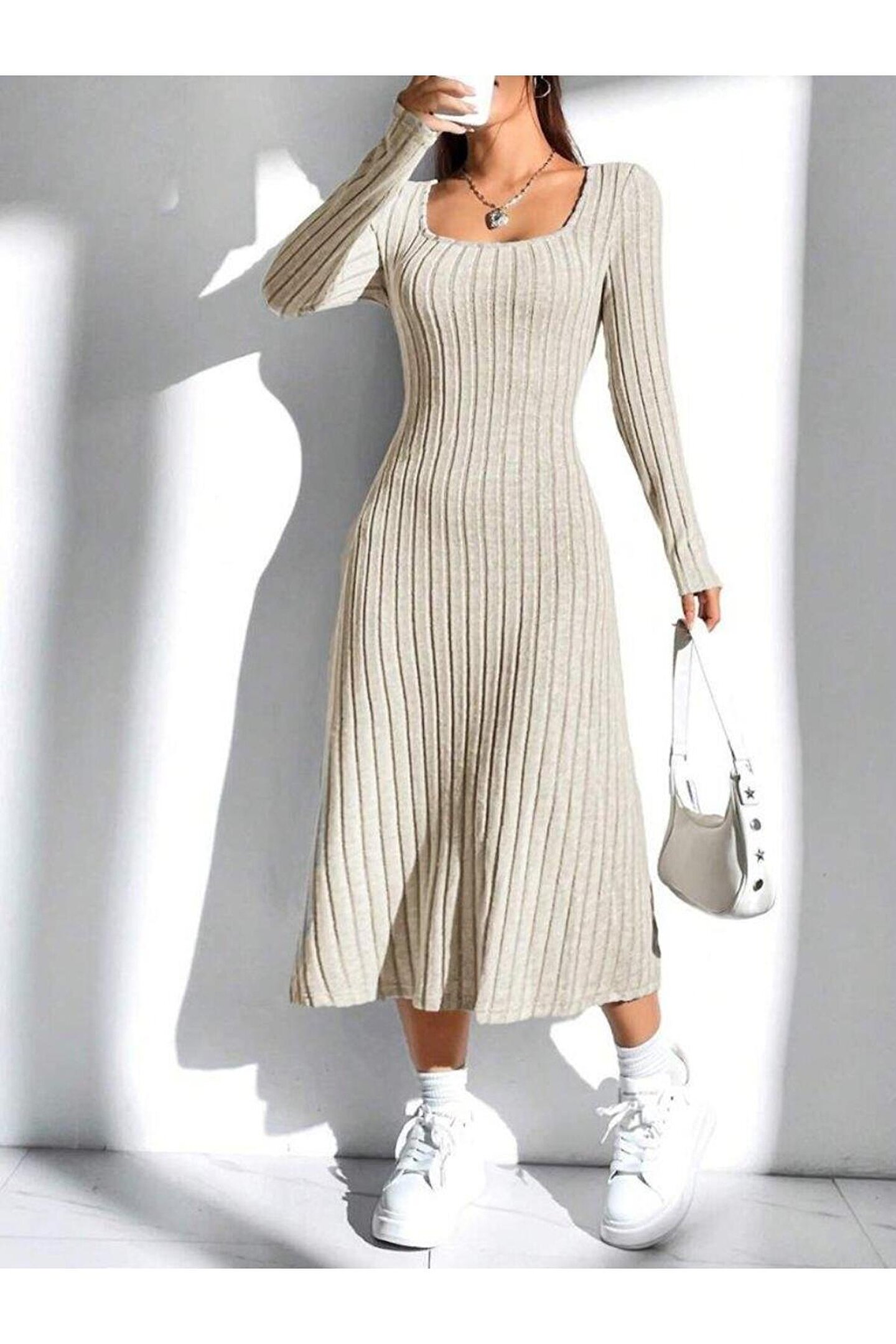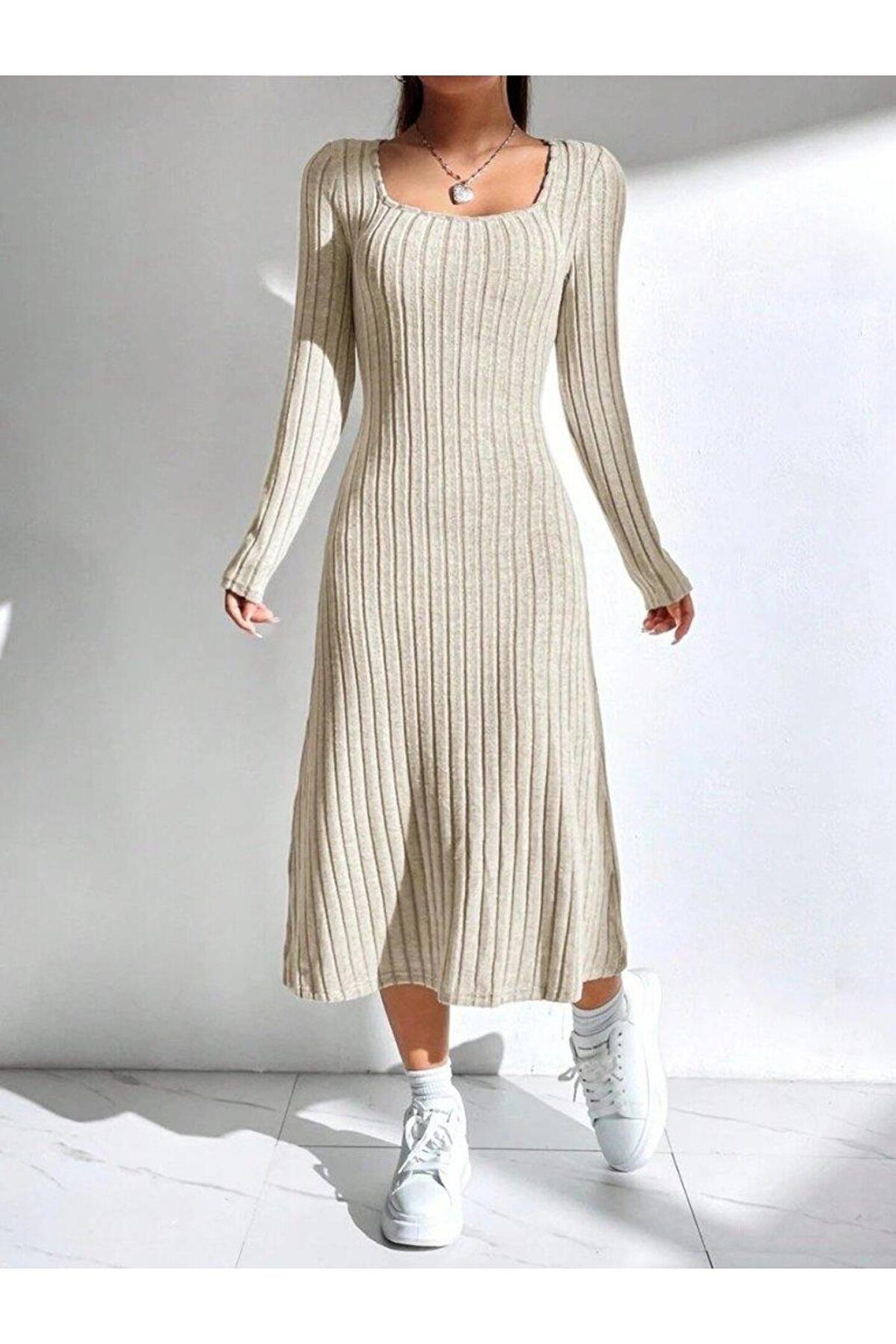 Kadın Uzun Kollu Kare Yaka Midi Kaşkorse Elbise