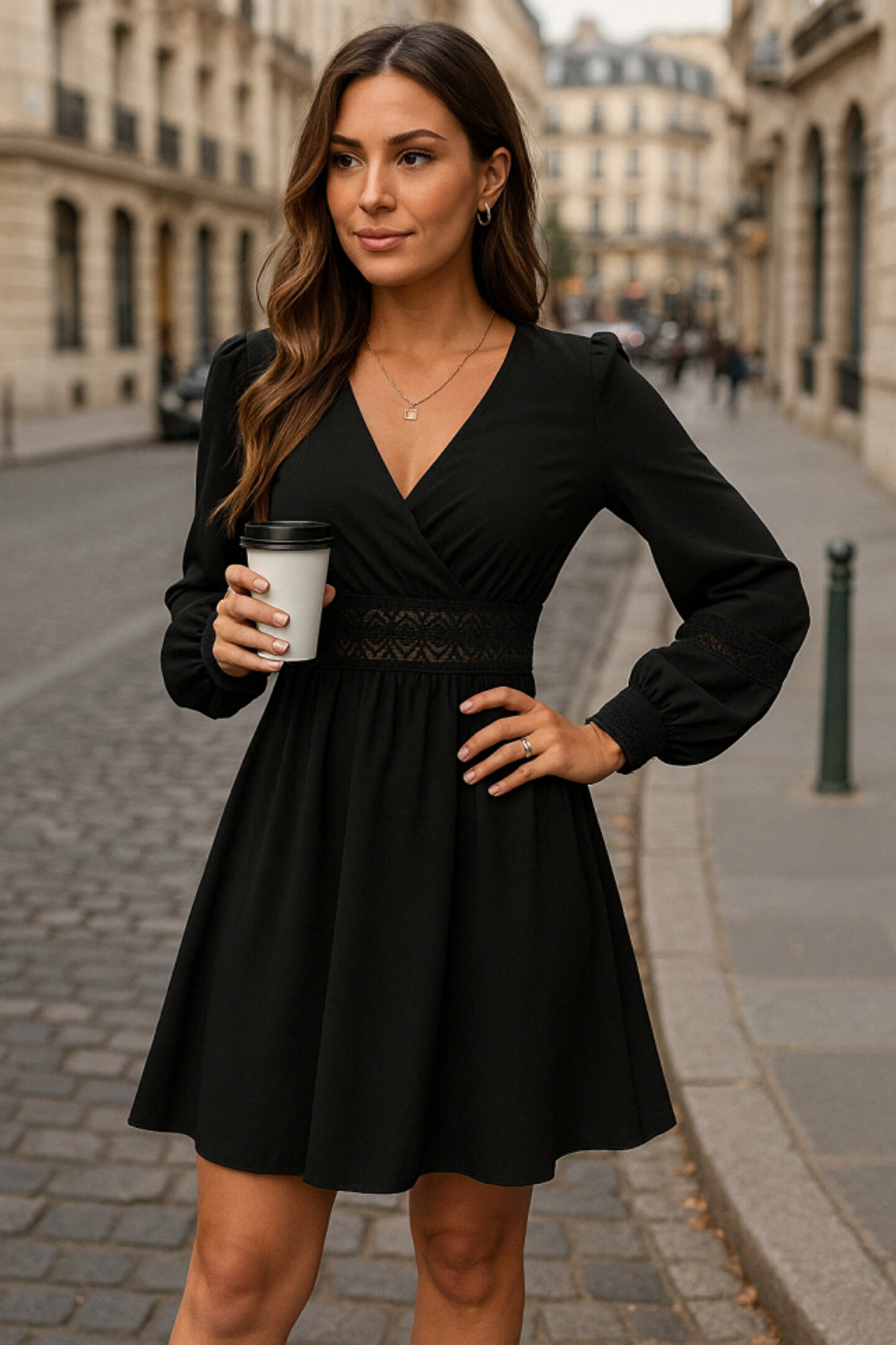 Luis & Lea Kadın Uzun Kollu Kruvaze Yakalı Dantelli Fermuar Detaylı Kısa Ithal Krep Elbise