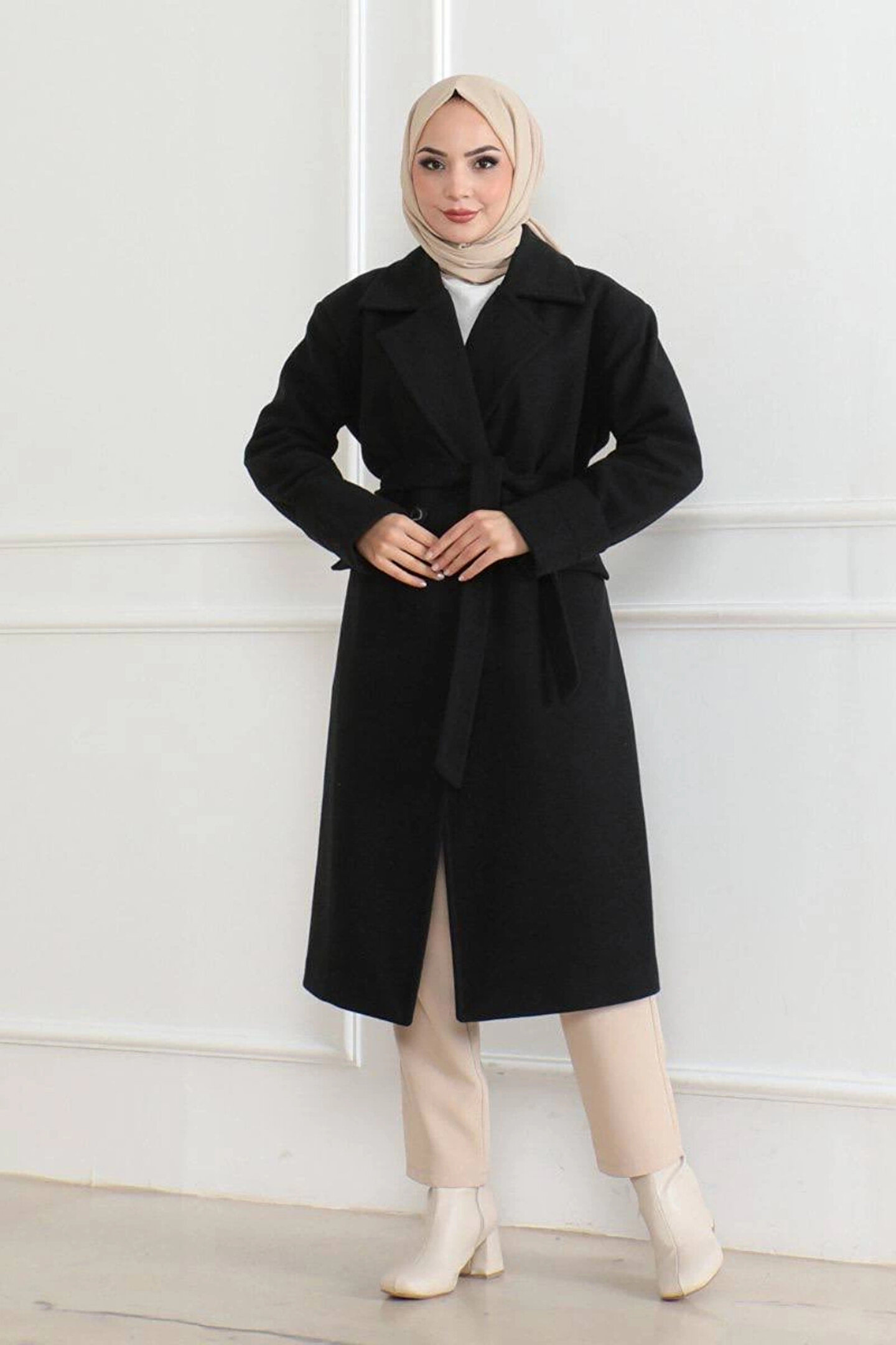 Lunvare Premium Kadın Düğmeli İçi Astarlı Kaşmir Kaşe Kaban - Siyah