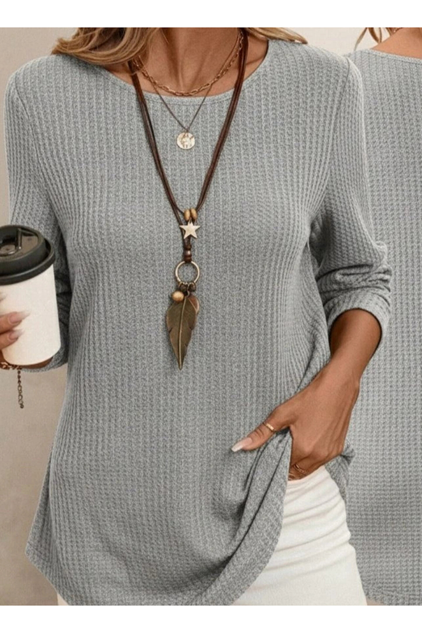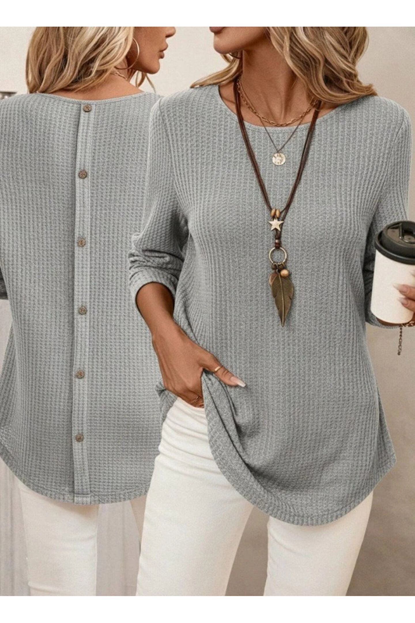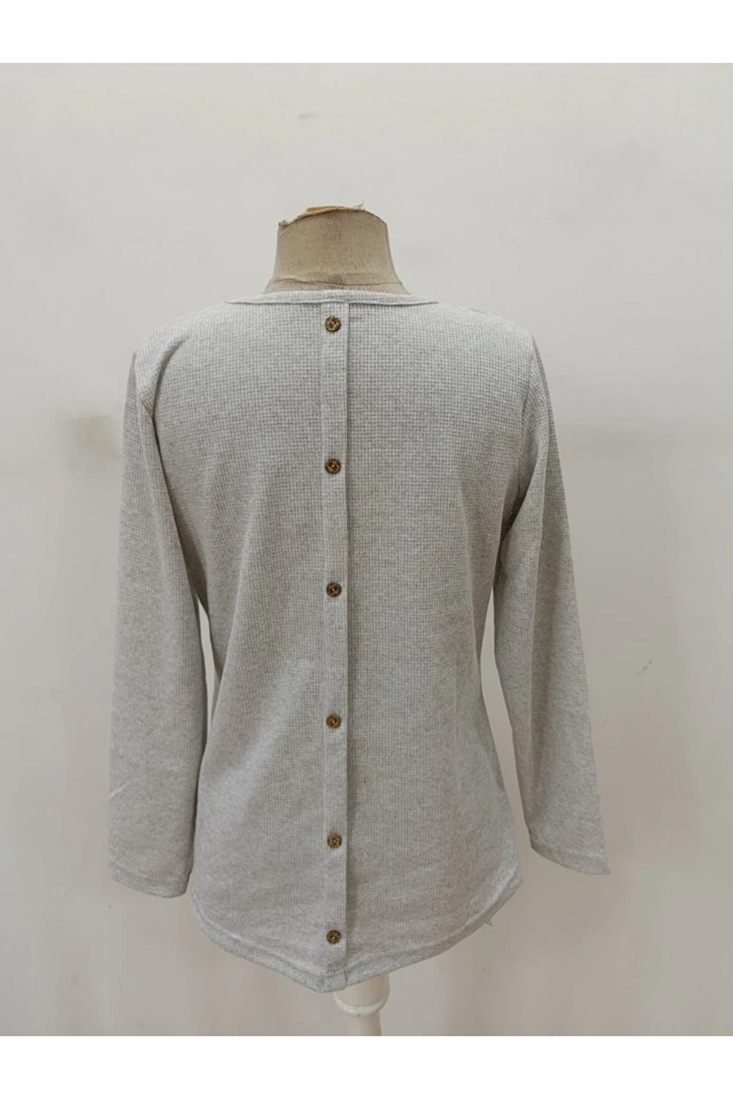 KadınUzun Kollu Yuvarlak Yaka Arkadan Düğmeli Waffle Bluz