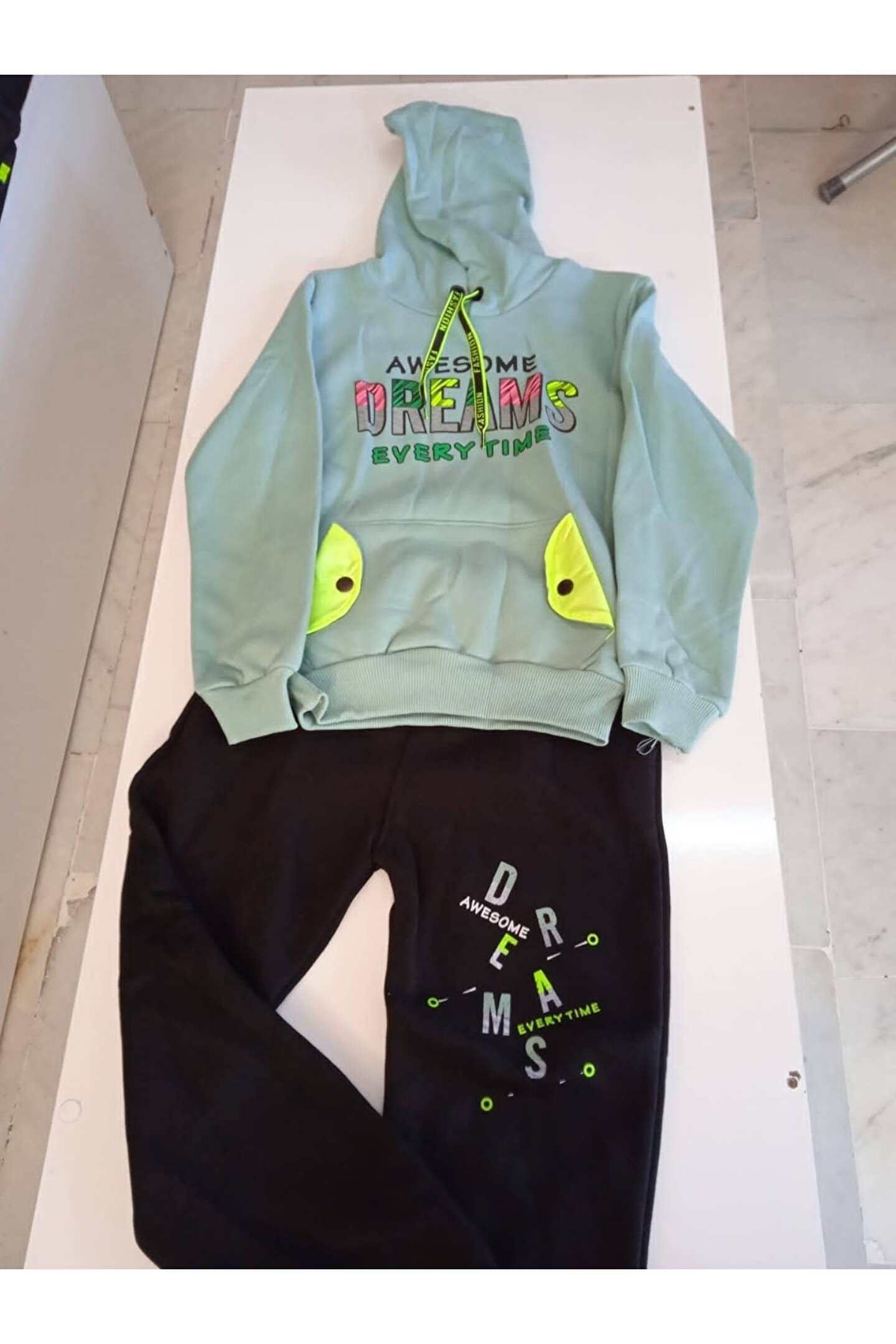 Mavera Fıstık Yeşili Baskılı Kangru Cepli Eşofmanlı Çocuk Takım