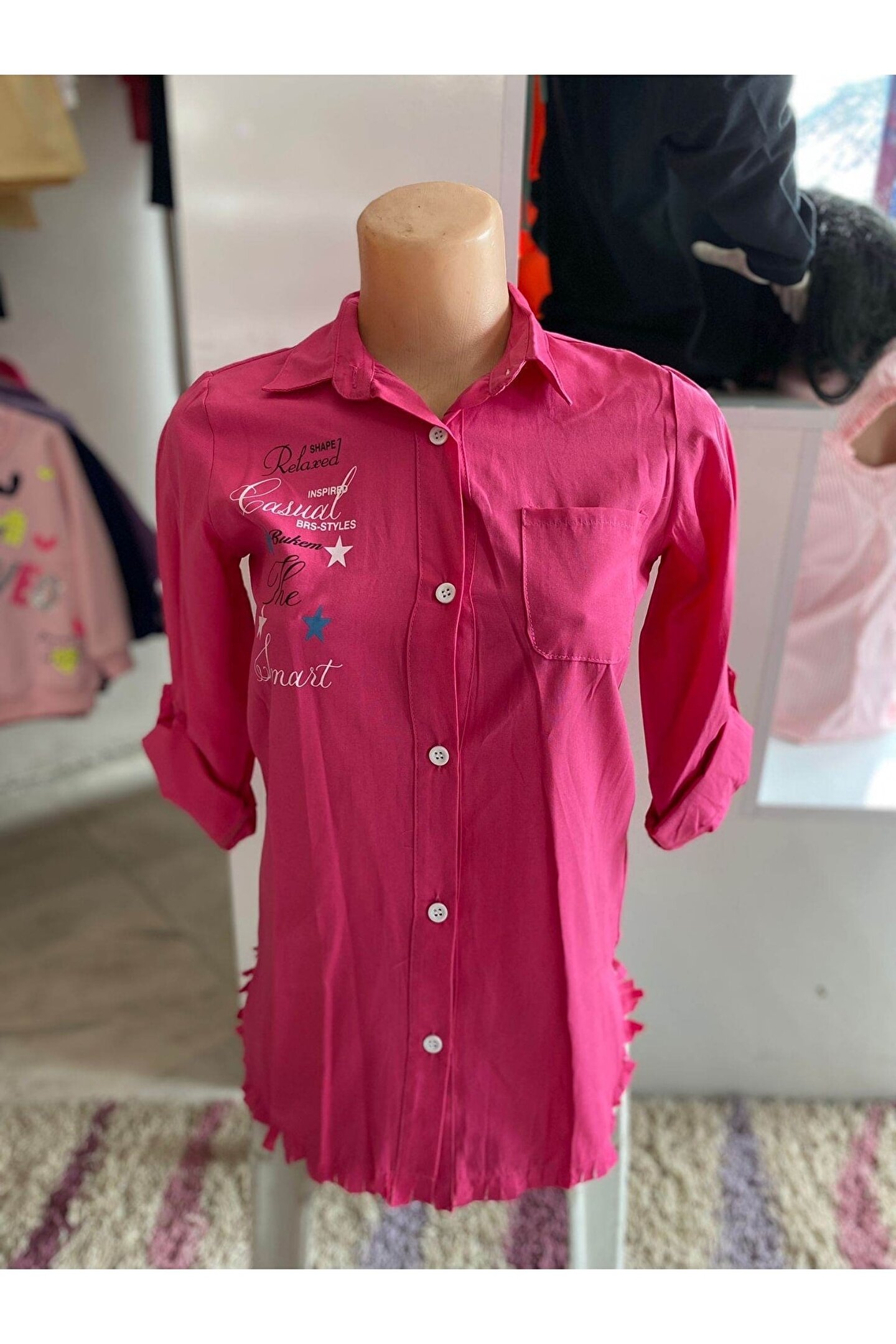Mavera Pembe Düğmeli Püsküllü Baskılı Gömlek