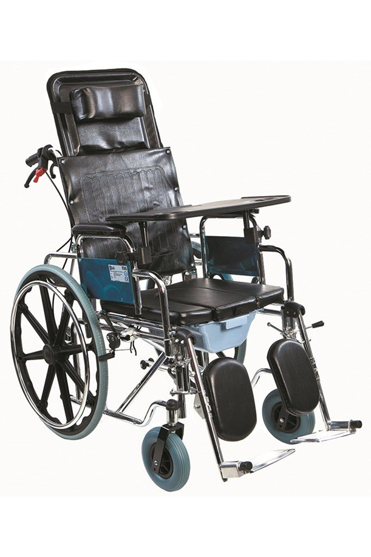 G4 tekerlekli sandalyeUzun süreli kullanımlarda kullanıcı rahatlığı göz önünde bulundurularak tasarlanmış sırtlık kısmı 6 kademede 160° yatırılarak şezlong pozisyonu alabilmektedir.Kullanıcının baş yapısına uygun ergonomiklikte pozisyonlandırılabilir başlığa sahiptir.Çıkarılabilir kolçaklar kullanıcının yatak, araba vb. alanlara transferini kolaylaştırır.Çıkarılabilir ayaklıkları sayesinde asansör vb. dar alanlarda ekstra manevra kabiliyeti sağlar.Ayaklıklar kullanıcı konforu düşünülerek, bacaklarını ileri doğru uzatabilmesine olanak sağlamak için 90° kaldırılabilir olarak tasarlanmıştır.Ayaklık ve baldırlık kısımları kullanıcı boyuna göre ayarlanabilir özelliktedir.200*50 PU ön tekerlekler yüzeyi bozuk alanlarda ve mazgallarda rahat sürüş sağlar.Katlanabilir gövde yapısı taşıma ve depolama kolaylığı sağlar.Basamak atlatma çubuğu ve el tutaçları sayesinde refakatçi kullanımına uygundur.Eğimli alanlarda ve şezlong pozisyonunda kullanımı sırasında kullanıcının geriye düşmesini engelleyen anti-tipper tekere sahiptir.Kullanıcının tuvalet ihtiyacını karşılayabilmesi için lazımlık şeklinde oturma yeri ve koku önleyici kapaklı lazımlık kovasına sahiptir. vinil döşeme, uzun süreli kullanımlarda bakteri oluşumunu engelle golfi 4 tekerlekli sandalye