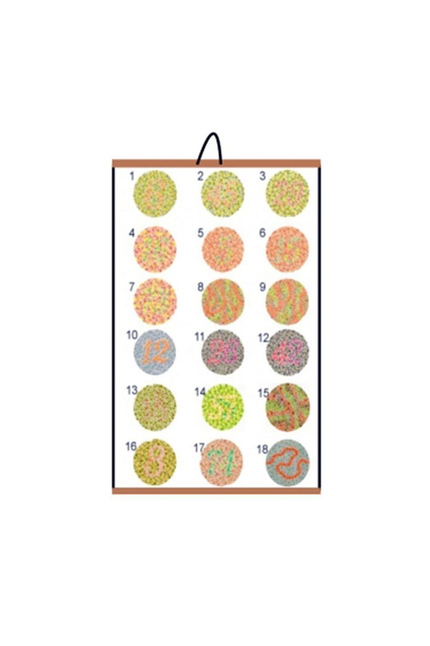 Renk Körlüğü Test Skalası Özellikleri; Duvara askı aparatı ile birlikte gönderilir. Vinleks malzemeden üretilmiştir. Ebatlar; En; 29CM Boy; 70CM Renk Körlüğü nedir? Renk körlüğü, kadınlardan fazla erkeklerde görülen, oldukça yaygın bir durumdur. Renkleri ayırt etme yeteneğinin bozukluğudur. En fazla görülen tipi, kırmızı ile yeşilin ayırt edilememesidir. Ender görülen bazı vakalarda ise bütün renklerin ayırt edilememesi ve dünyanın siyah – beyaz görülmesi söz konusudur. Her 20 erkekten ve her 200 kadından birinde vardır. Renk Körlüğü çeşitleri; Kırmızı renge duyarlı olan koni hücreleri yok ise (Protonopia) kırmızı renk körlüğü, Mavi renge duyarlı koni hücreleri yok ise, (mavi renk körlüğü), Yeşil renge duyarlı koni hücreleri yok ise, (Deuteranopia) yeşil renk körlüğü, Kırmızı rengi ayırt eden koni hücresinin olmadığı bir durum olan protonopia renk körlüğünde sadece koyu kırmızı renk algılanmayacaktır. Kişinin gördüğü renkler koni hücreleri durumu ile ilgili olarak yeşil, mavi ve bu iki rengin karışımıyla görülen renkler olacaktır. Yeşil ayrımı yapan yeşile duyarlı konilerin bulunmadığı deuteronopia renk körlüğü durumunda ise, yalnızca kırmızı ve mavi renkler ile bunların karışımı görülecek. Yeşil renkler ayırt edilemeyecektir. Yalnızca tek renk konisinin mevcut olduğu durumlarda , diğer iki renk koni sinin olmadığı renk görme sorununa monokromatik renk körlüğü denmektedir.Örnek verecek olursak sadece mavi rengi algılayan mavi renk konilerinin mevcut olduğu bir durumda, kırmızı ve yeşil renk konilerinin bulunmadığı durumlarda kişi yeşil ve kırmızı renkleri ayırt edemeyecektir. Monokromatik renk körleri sadece mavi ve sarı renkleri tanımlayabildiğinden, bu durum kırmızı-yeşil renk körlüğü olarak adlandırılabilir.