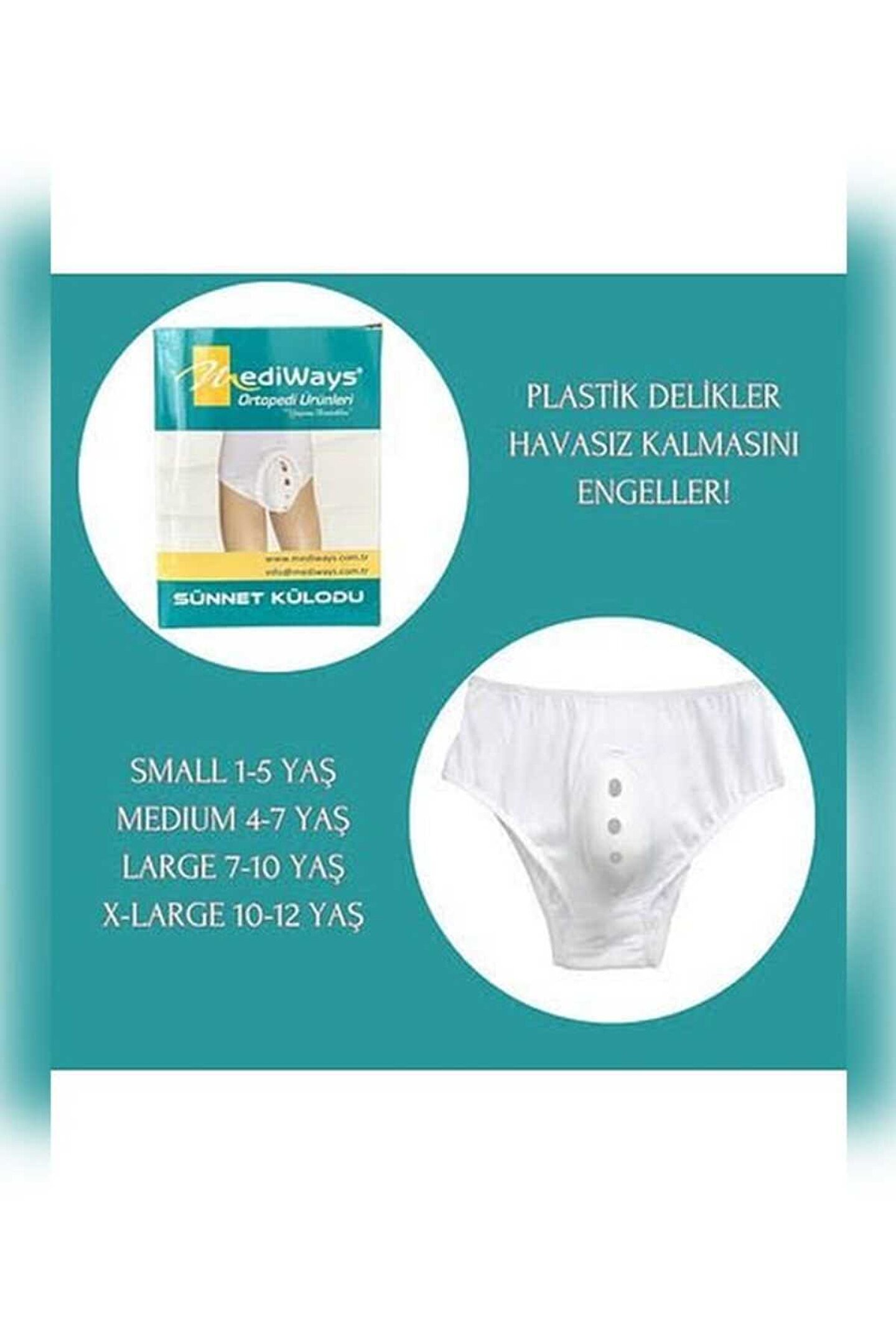 SMALL 1-4 YAŞ MEDIUM 4-7 YAŞ LARGE 7-10 YAŞ XLARGE 10-12 YAŞ Ç ocuğunuzun sünnet sonrasında acısız vakit geçirmesini sağlayacak olan bu külot, çocuğunuzun rahat edeceği ve acı duymasını engelleyecek harika bir giyimdir. Kapatıcı bez : Söktükten sonra koruyucu plastiği küloda takın yaralı bölgenin plastiğe temas etmesini istemiyorsanız eczanelerdende temin edebileceğiniz steril yapışkanlı pedi plastiğin içine yerleştirin yıkama sırasında plastiği çıkarın sünnet tedavisinden sonra çıtçıtlar sayesinde dilerseniz normal külot olarakta kullanabilirsiniz % 100 naturel ve anti alerjiktir; Bu üründen en fazla 10 adet sipariş verilebilir. 10 adetin üzerindeki siparişleri Trendyol iptal etme hakkını saklı tutar. ; Kampanya fiyatından satılmak üzere 50 adetten fazla stok sunulmuştur. ;