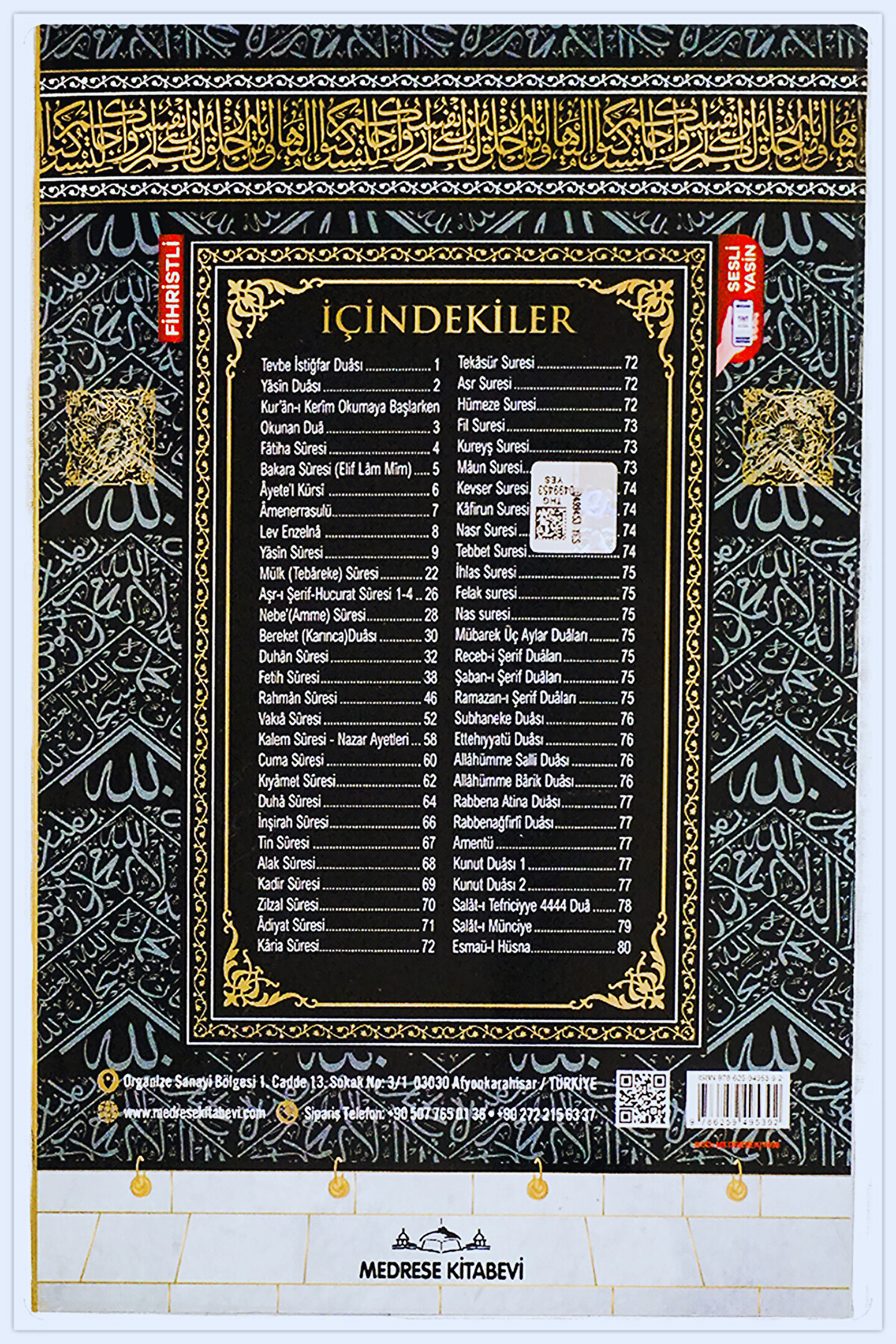 Ürünümüzün Genel Özellikleri: • Ebat: Orta boy 16*24 cm • Sayfa Sayısı: 80 sayfa • Kapak Kâğıdı: Selefonlu Amerikan Bristol Kapaktır.; ; • Kâğıt cinsi 55 gr İthal Kitap kâğıdıdır.; ; • Bilgisayar hatlı olup kolay okunabilir.; ; İri yazılı font ile yazılmıştır.; ; • Meal: Elmalılı M.; Hamdi Yazır • Arapça metin, Arapça okumayı bilmeyenler için Türkçe okunuşu ve Türkçe anlamı vardır.; ; Harekeler Harflerin Hemen Altında ve Üstünde Sıralanmıştır • Sayfalarımızda bulunan QR kod ile akıllı telefon veya tabletlerinizden Arapça okunuşunu ve Türkçe Mealini sesli olarak dinleyebilir ve takip edebilirsiniz.; ; • Arapça Metinde harekeler Harflerin Hemen Altında ve Üstünde Sıralandığından acemilik çekmeden ve hata yapmadan rahat okuyabilirsiniz.; ; • Kuranı Kerimi Okumaya Yeni Başlayanlar, acemilik çekmeden rahat okuyabilirler.