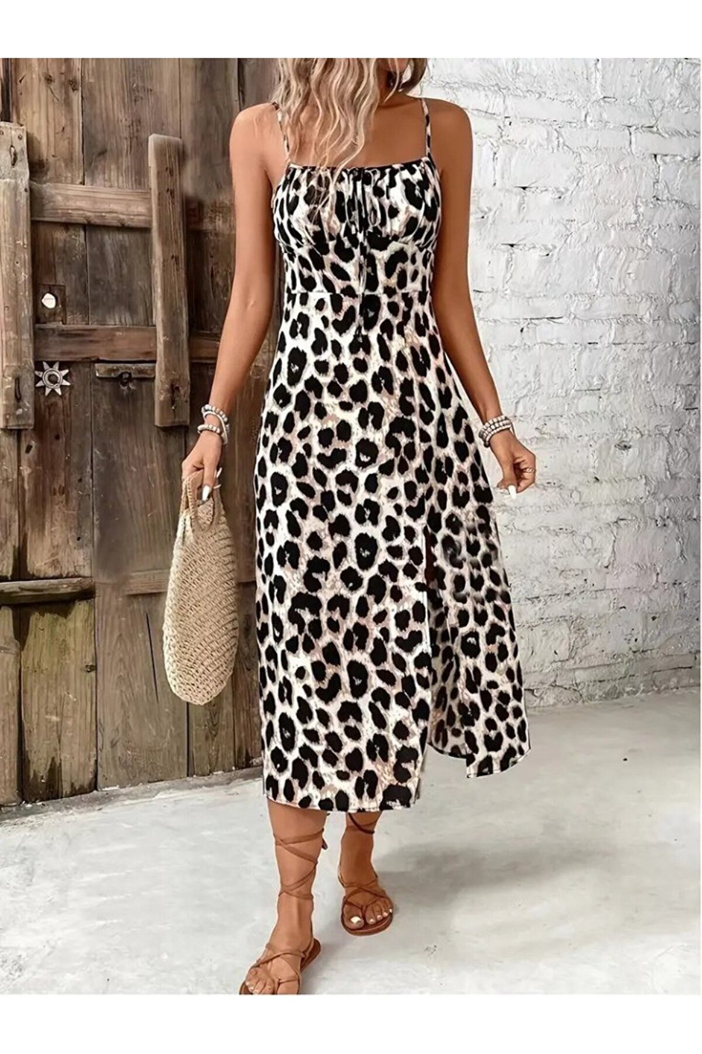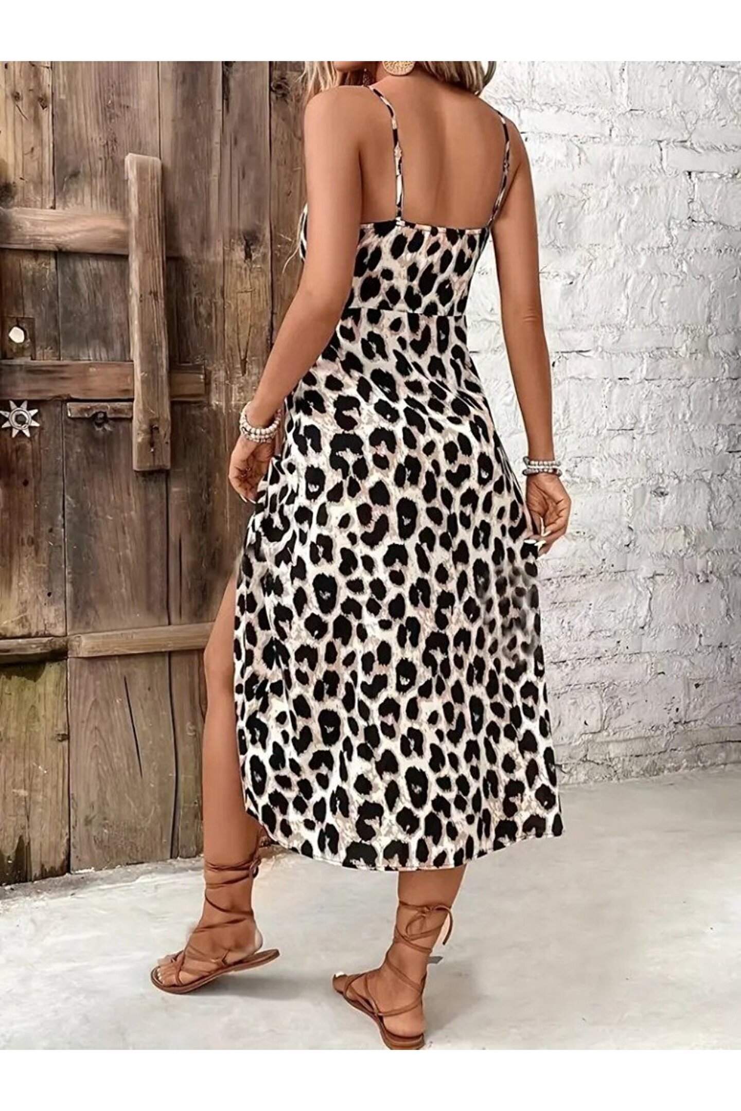 Kadın Askılı Yakadan Bağcıklı Yırtmaçlı Leopar Desenli Midi Süprem Elbise