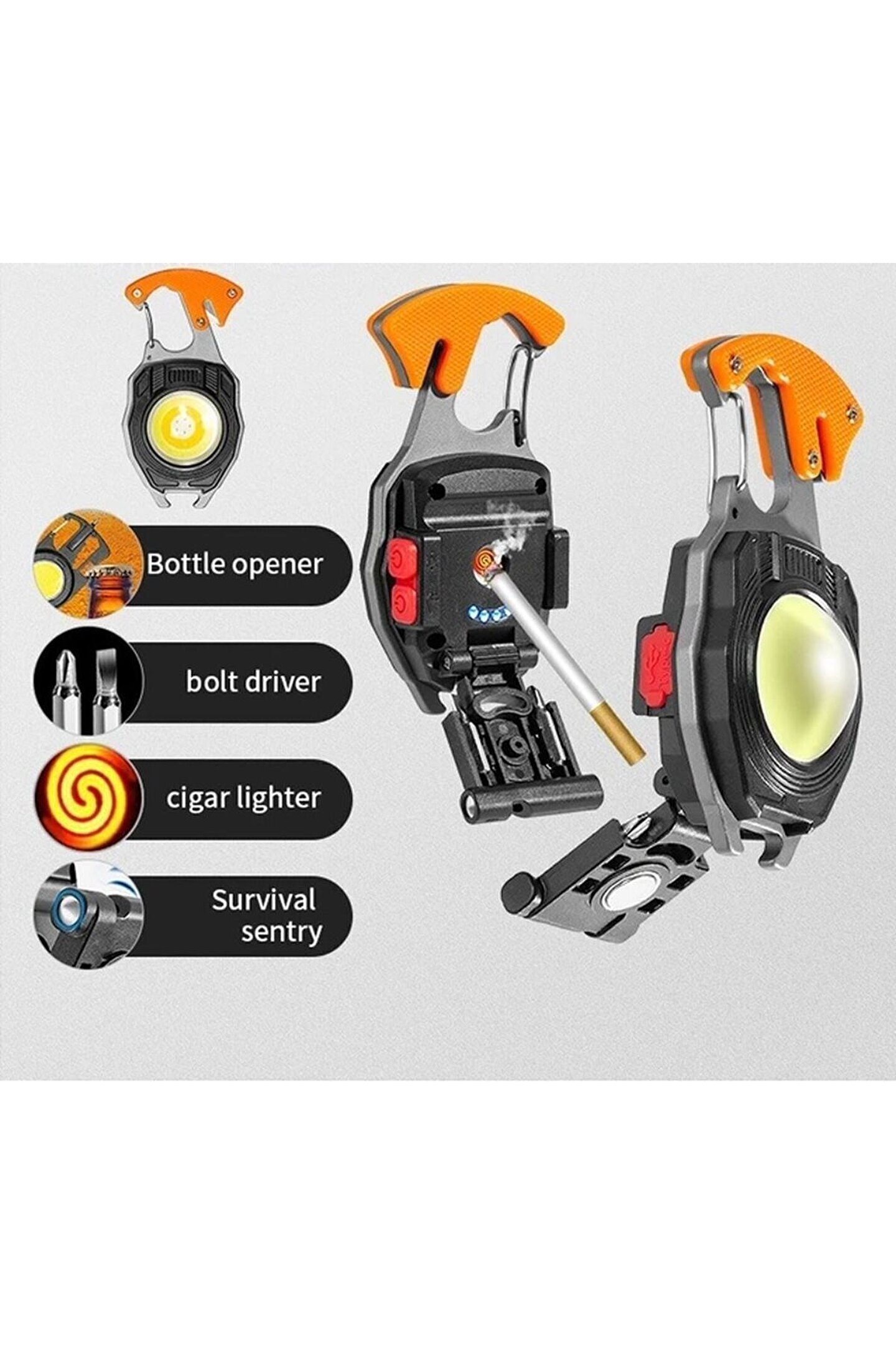 Şarj edilebilir özelliği sayesinde, kamp yaparken veya doğa yürüyüşlerinde enerji ihtiyacınızı karşılar ve taşınabilirliği ile her an yanınızda; Çoklu mod seçeneği ile farklı aydınlatma ihtiyaçlarınıza uygun olarak ayarlanabilir parlaklık seviyeleri sunar; İkaz lambası özelliği ile acil durumlarda dikkat çekici bir sinyal vermenizi sağlar; Tornavida ve açacak gibi ekstra aletler, kamp ekipmanlarınıza kolayca erişmenizi ve kullanmanızı mümkün kılar; Düdük, acil durumlarda sesli uyarı vererek güvenliğinizi artırır;