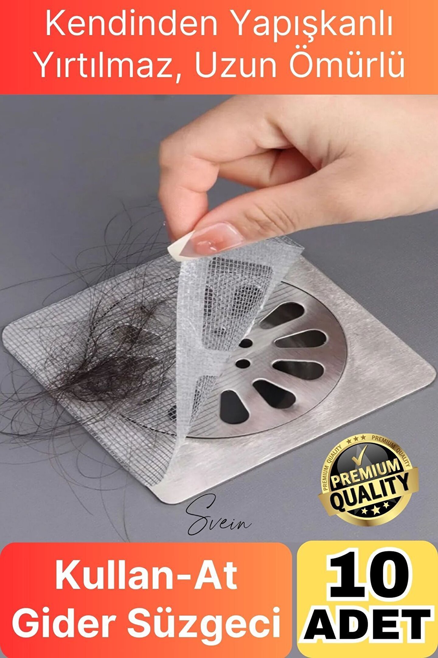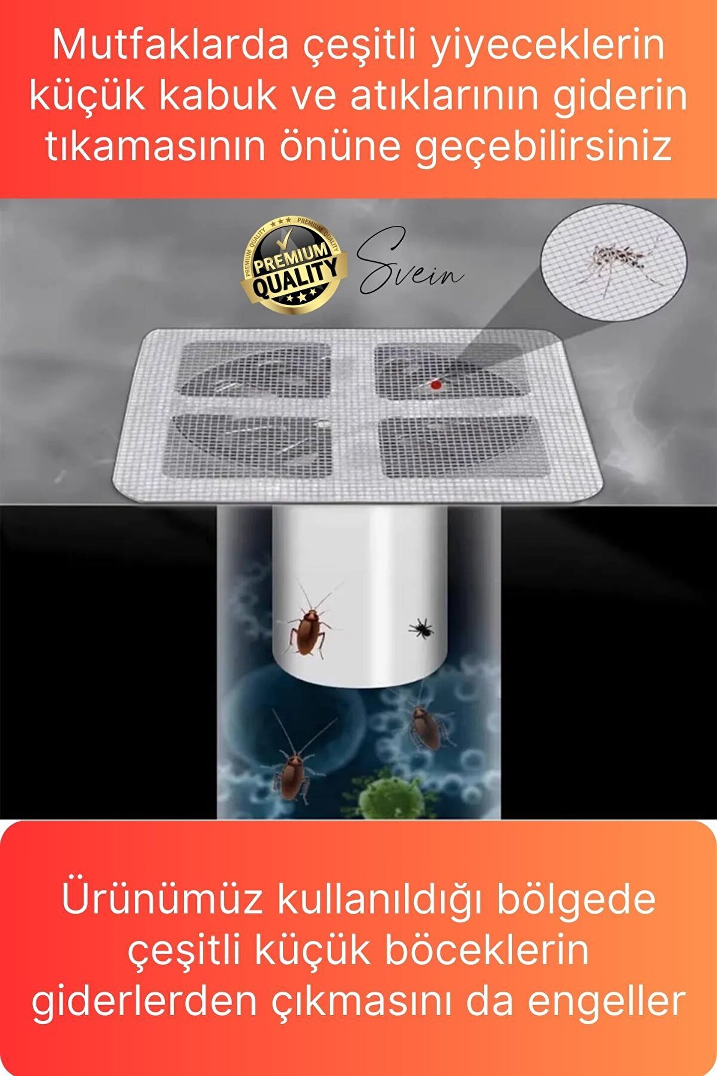 ; Duş ve lavabo giderlerinin çeşitli nedenlerle tıkanması günlük hayatta çok sık karşılaştığımız sorunlardan biridir. ; ; Gerek saç, kıl ve tüy gibi nedenlerden, gerekse yiyecek atıklarından dolayı tıkanan ve sorun yaratan bu durumla başa çıkmak artık çok kolay. ; ; Özel delikli ve süzgeçli yapısı ile saç, tüy, kıl ve yiyecek atıkları gibi gideri tıkana durumların önüne geçmek için tasarlanmıştır. ; ; Kare yapısı ile giderinizin üzerini tamamen kapatan ürünümüz atık suların geçeceği boyuttaki delikleri sayesinde su dışındaki gideri tıkayan her türlü şeyin geçmesini önler. ; ; Ürünümüz kullanıldığı bölgede çeşitli küçük böceklerin giderlerden çıkmasını da engeller. ; ; Yapışkanlı tasarımı ile kolayca dilediğiniz yere yapıştırabilirsiniz. ; ; Dilediğiniz zaman kolayca yerinde çıkartıp çöpe atabilir ve yenisi yapıştırarak kullanmaya devam edebilirsiniz. ; ; Ürünümüzü farklı gider boyutlarına göre makasla 4 ayrı parçaya ayırıp da kullanabilirsiniz. ; ; Mutfaklarda çeşitli yiyeceklerin küçük kabuk ve atıklarının giderin tıkamasının önüne geçebilirsiniz. ; ; Ürün Ölçüsü: 10 x 10 cm ; ; Paket içeriği: 10 adet. ; ; Kontrolleri yapıldıktan sonra özenle paketlenerek sorunsuz bir şekilde gönderilmektedir. ;