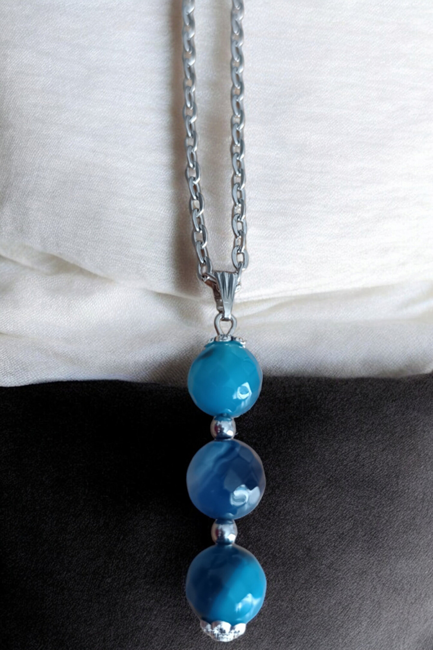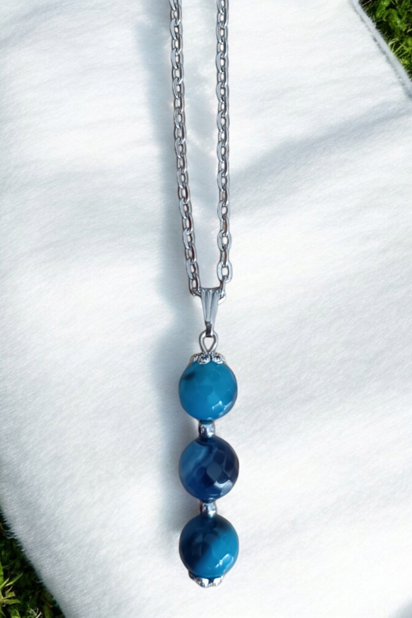 - Mavi renkli Faset Akik Taşı ile süslenmiş, her birinde 10 mm çapında 3 adet taş bulunan bu kolye, zarif tasarımıyla dikkat çeker.; - Doğal taş kullanımı sayesinde her kolye benzersiz ve otantik bir görünüm sunar.; - Metal süslemeli alt ve üst kısımları ile şıklığına şıklık katar.; - 2 cm uzunluğundaki taşlar, zarif bir boyutta estetik bir etki yaratır.; - 56 cm uzunluğundaki kalın zincir yapısı, rahat bir kullanım sağlar ve günlük giyime uygundur.; - Kutulu paketiyle hediye olarak da tercih edilebilecek ideal bir seçenektir.; - Yetişkin kadın ve kızlar için uygun olan bu kolye, her yaş grubuna hitap eder.
