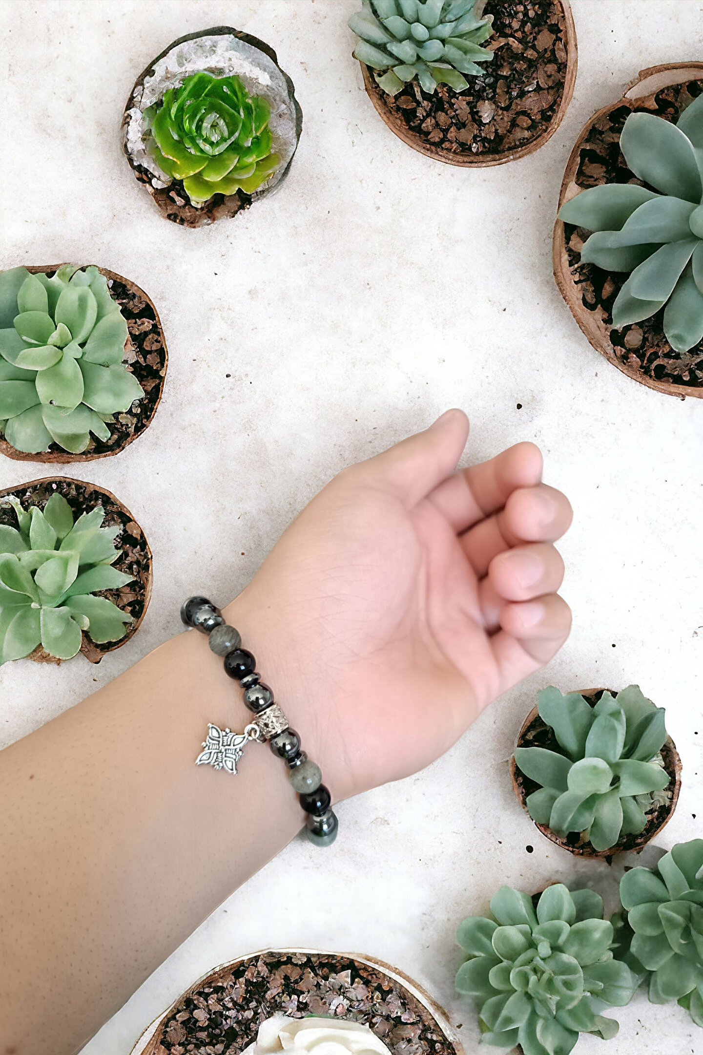 Tüm Taşlarımız Doğal Orijinal GerçekTaştır Piyasada Sentetik boncuk Taşlar ile lütfen Mukayese etmeyin ; Tüm ürünler orijinal Sertifika ilegönderilir Faturanız kesilir Sisteme işlenir ; Taşlar : Labradorit Taşı Oniks Taşı Hematit Taşı ; Kesim: Normal kesim model + Disk kesim ; Taş boyutu : 8 mm - hematit disk 6 mm ; Taş sayısı : Bedenlere göre değişim olur ; Aparat: Metal Desenli ; Metal: Paslanmaz kaplama metallerdir ; Görüntü: Resim Ortalama 20-21 cm göreçekilmiştir ; Bilek yapınıza göre ayarlanacakmodelde taş + artı yada - eksi olabilir ; Bileklik ölçüsü: 16-17 cm - 18-19 cm -20-21 cm - 22-23 cm ; Sargı: 1 mm misina ipi Kalite: Doğaltaşlar ; Ürün içeriği: bileklik + sertifika +yedek misina ; Ambalajı: Seçenekler Mevcuttur ; Paket içeriği : 1 adet bileklik + 20-25cm uzunluğunda1 adet yedek misine ; İp: Esnek uzayıp kısalabilen misina herbileğe uyum sağlar bileği sıkmaz ; Ayrıca yedek misina gönderilmektedirbileklik bilek yapınıza göre yeniden tasarlayabilirsiniz ;