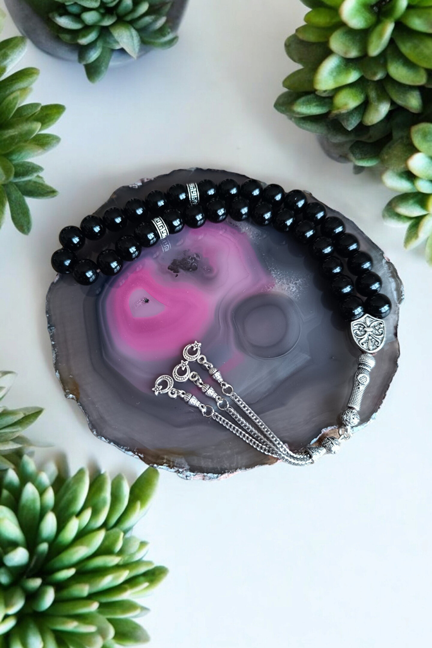 Oniks taşı tesbih, doğal taş materyalden üretilmiş olup, her bir tesbih tanesi 10 mm boyutundadır; Parlak oniks taşı ile tasarlanmış bu tesbih, şıklığı ve zarafeti bir arada sunar; Düz deseni sayesinde sade ve klasik bir görünüm sergiler, her tür kıyafetle uyum sağlar; Sertifikalı özel MDF kutusu ile birlikte gelir; bu sayede tesbihinizi güvenle saklayabilir ve taşıma kolaylığı yaşayabilirsiniz; Erkekler için ideal bir hediye seçeneği olan bu tesbih, 33'lük özel tasarımıyla manevi değeri artırır;