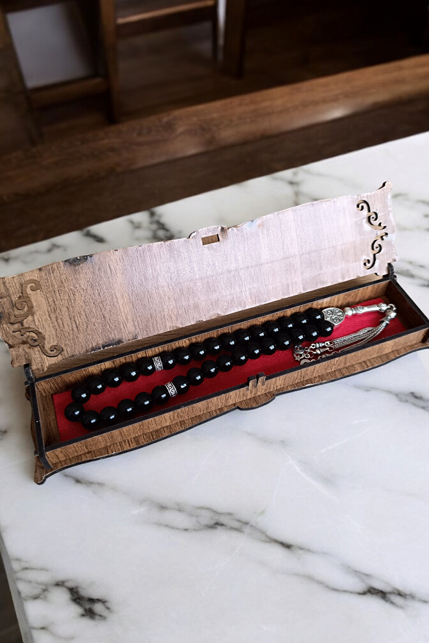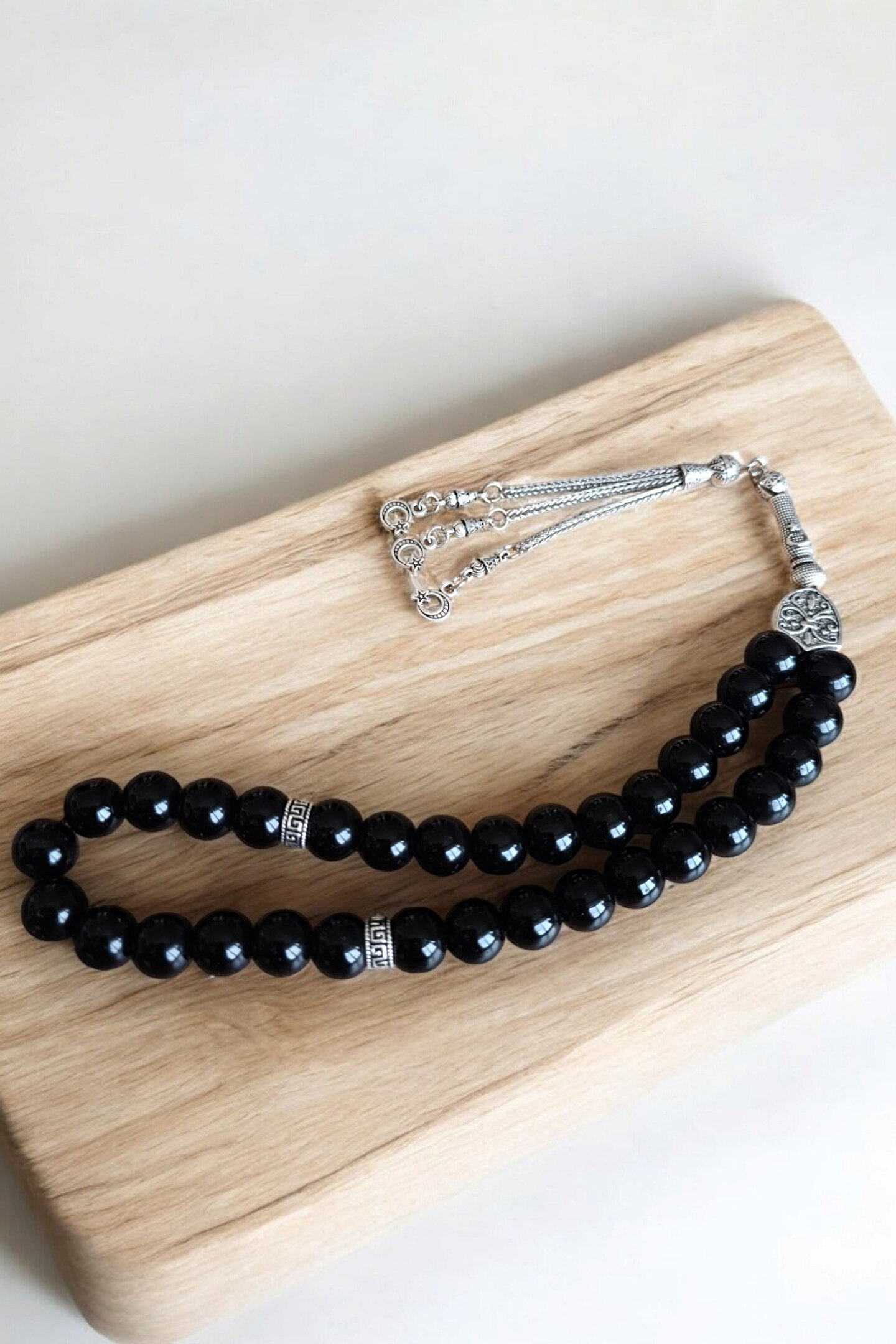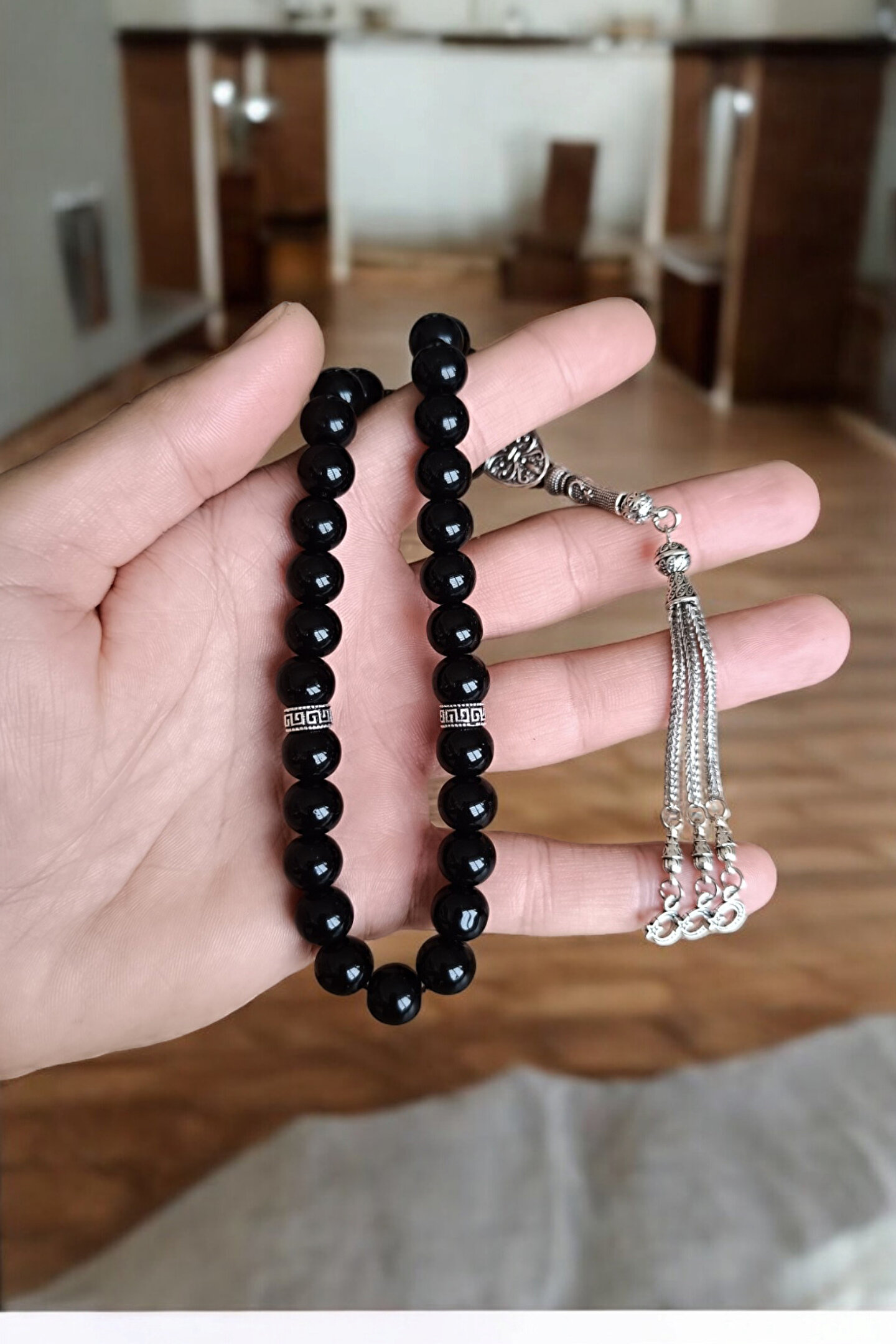 MGA DOĞAL TAŞ Parlak oniks Tesbih 33lük Tesbih Oniks Taşı Tesbih Sertifikalı Özel MDF kutusunda 10 mm