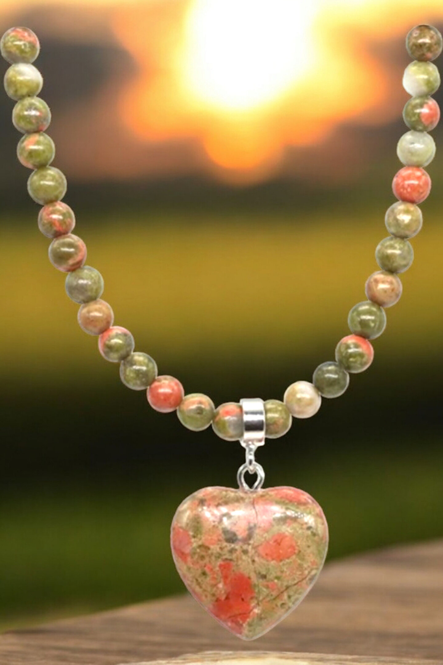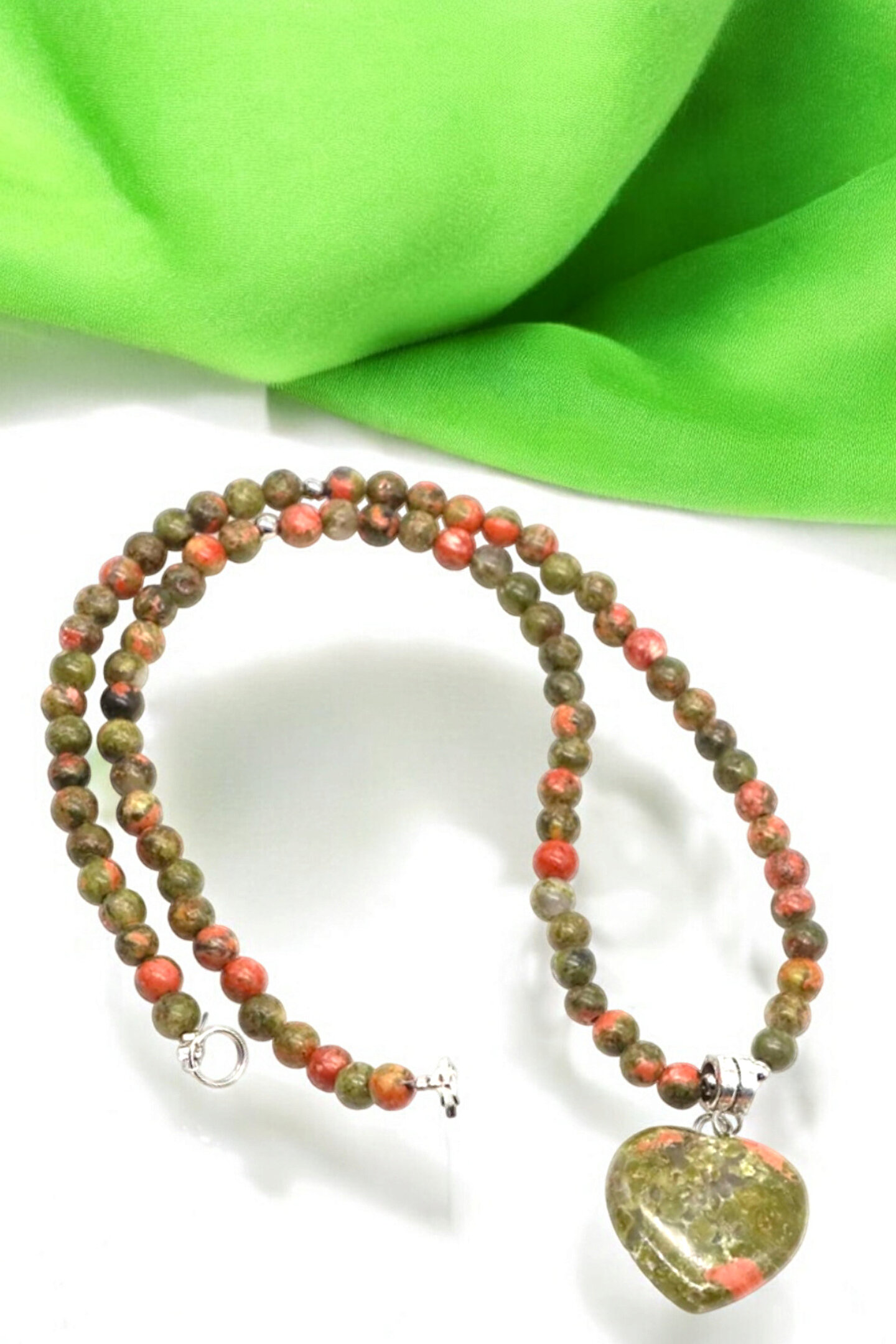 Doğal taş kullanımı ile öne çıkan bu kolye, şıklığınızı tamamlayacak zarif bir aksesuardır; Unakit taşı, kolyenin ana malzemesi olarak seçilmiştir ve bu sayede benzersiz bir görünüm sunar; Çelik tel zincir, dayanıklılığı ve modern tasarımı ile dikkat çekerken, gerçek doğal taş kullanımı ile de kaliteyi ön plana çıkarır; 4 mm kalpli tasarım, hem günlük kullanım hem de özel günler için ideal bir seçenektir; Ametist taşı detayı ile zenginleştirilmiş bu kolye, hem estetik hem de enerji açısından zengin bir deneyim sunar;