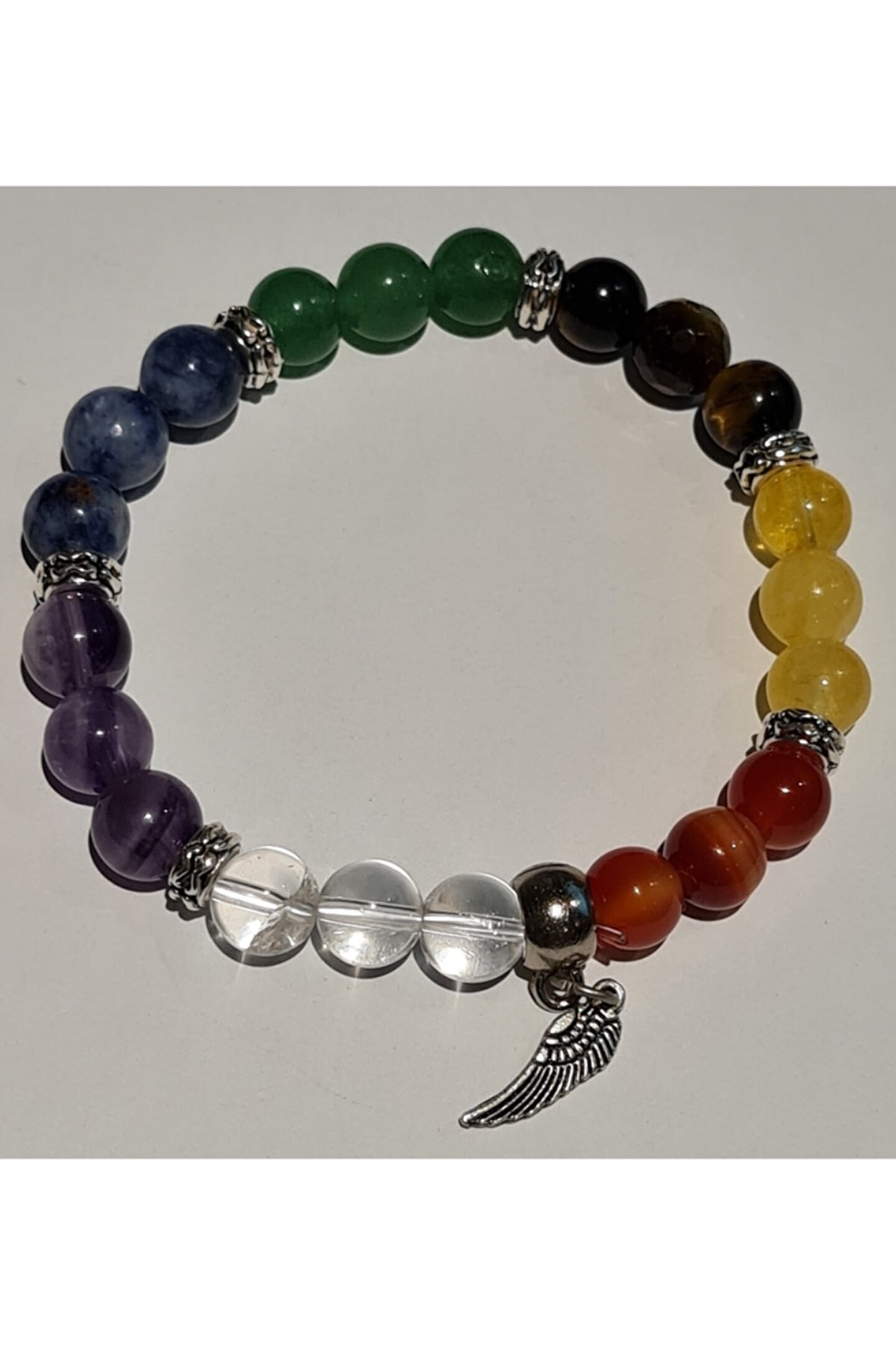 7 Çakra Taşı Bilekliği - 3 Adet Kristal Kuvars -3 adet Ametist -3 Adet Sodalit -3 Adet Aventurin -3 Adet Kaplan Gözü -3 Adet Sitrin -3 Adet Akik Doğal taşları bulunmaktadır. ; -6 ara halka ve ucunda Melek Kanadı Süsü vardır. ; **Şeffaf Misine Kullanılmıştır. ; Takması ve çıkartması çok kolaydır. ; -İsime göre kodlama yapılacaktır. ; Lütfen soru sor kısmından İsim soy isim doğum tarihinizi yazar mısınız?;