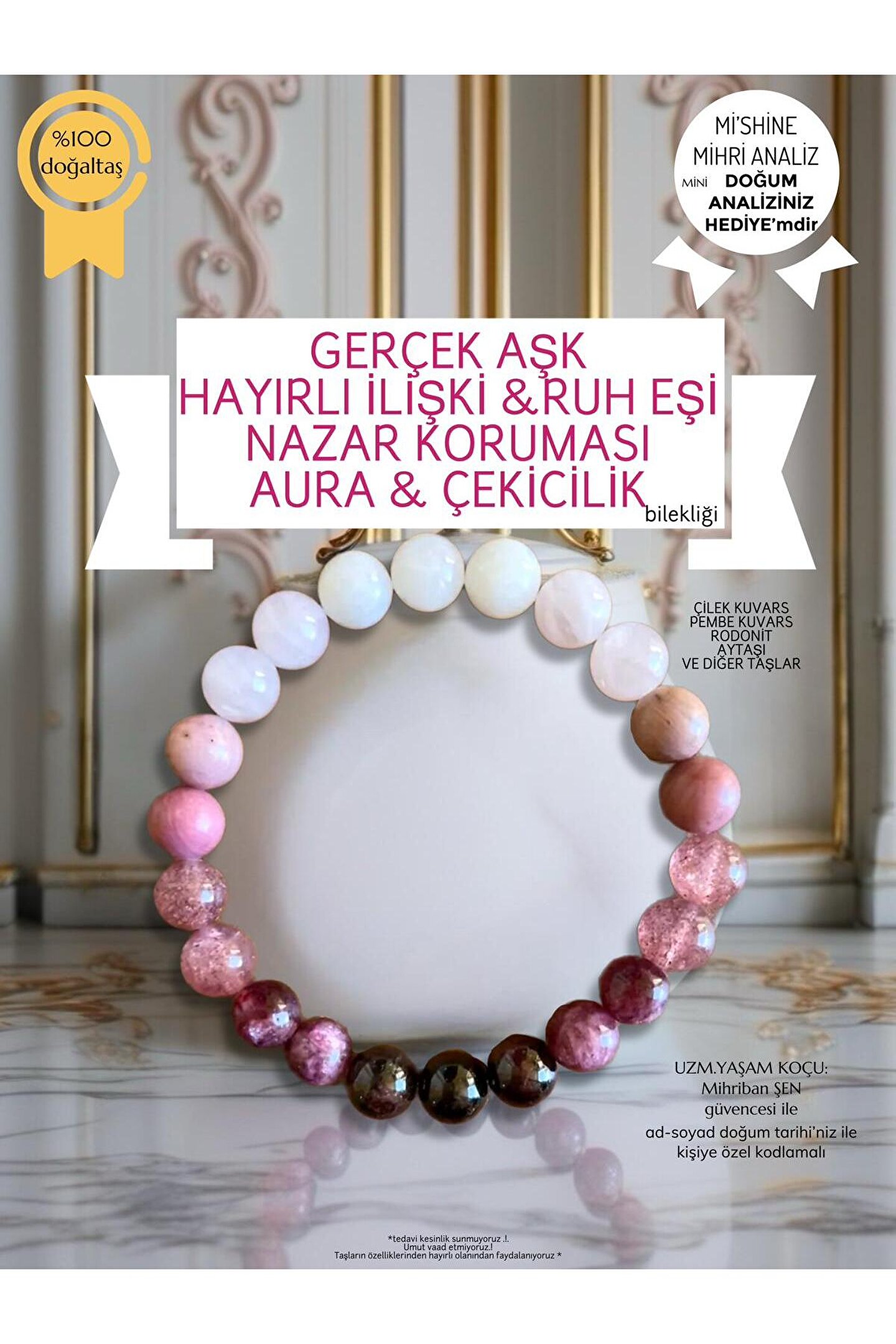 Unisex tasarımı ile herkesin kullanımına uygun, şıklığı ve işlevselliği bir arada sunan aşk ve nazar koruma bilekliği.; Doğal taş kullanımı sayesinde hem estetik hem de enerjik bir aksesuar deneyimi yaşatır.; Yetişkinler için ideal boyutlarda üretilmiş olup, günlük kullanımda rahatlıkla tercih edilebilir.; Türkiye'de el emeğiyle üretilen bu bileklik, yerel kaynaklı malzemelerle sürdürülebilir moda anlayışını destekler.; Hem erkekler hem de kadınlar tarafından beğenilerek kullanılabilen bu aksesuar, kişisel tarzınızı tamamlamanız için mükemmel bir seçenektir.; Ruh eşinizi hayatınıza çekmeyi kolaylaştırır.; Var olan ilişkide kişinin iletişimini güçlendirir.; Aşk hayatınıza renk katar.; Ad soyad bilgileriniz sipariş oluşturduktan sonra hediye paketi yap butonundan yazabilirsiniz.; Kişiye özel kodlama ile teslim edilmektedir.;