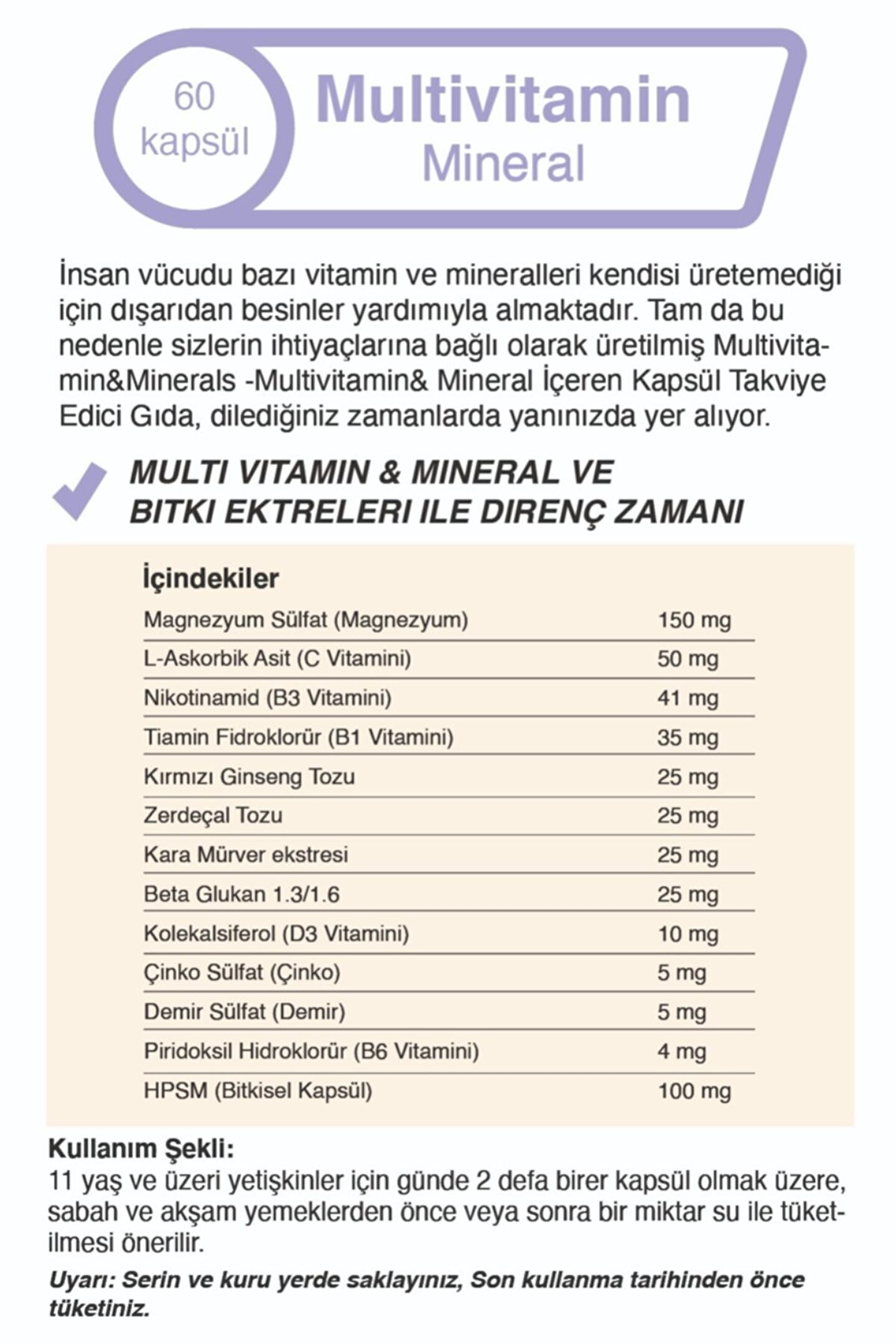 İnsan vücudu bazı vitamin ve mineralleri kendisi üretemediği için dışarıdan besinler yardımıyla almaktadır. Bu aşama da ise önemli olan vitamin ve minerallerin düzenli olarak belirli miktarların altında ya da üzerinde olmayacak şekilde almaktadır. Bu noktada dikkat etmemiz gereken tek şey ise düzenli ve sağlıklı beslenmek oluyor Hatta mevsim geçişleri soğuk kış ayları gibi süreçlerde bağışıklık sistemimiz daha zayıf oluyor ve bu vitamin ve minerallere daha çok ihtiyaç duyabiliyoruz. Tam da bu nedenle sizlerin ihtiyaçlarına bağlı olarak üretilmiş Multivitamin&Minerals -Multivitamin& Mineral İçeren Kapsül Takviye Edici Gıda, dilediğiniz zamanlarda yanınızda yer alıyor. Yüksek Besin Değerlerine Sahip İçeriği; Magnezyum Sülfat (Magnezyum), L-Askorbik Asit (C Vitamini), Nikotinamid (B3 Vitamini), TiaminHidroklorür (B1 Vitamini), Kırmızı Ginseng, Zerdeçal, Kara Mürver Ekstresi, Beta Glukan 1.3/.16, Kolekalsiferol (D3 Vitamini), Çinko Sülfat (Çinko), Demir Sülfat (Demir), PiridoksinHidroklorür (B6 Vitamini).ile son derece güvenilirdir. Kullanım Şekli: 11 yaş ve üzeri yetişkinler için günde 2 defa birer kapsül olmak üzere, sabah ve akşam yemeklerden önce veya sonra bir miktar su ile tüketilmesi önerilir. Uyarı: Serin ve kuru yerde saklayınız,; Son kullanma tarihinden önce tüketiniz.; İlgili yasa ve yönetmelikler gereği bitkisel destek ürünleri ile ilgili, hastalık adı veya endikasyon belirterek tanıtım yapılmamaktadır. Bilgilendirme! Ürün bilgileri ve görselleri üreticiler ve/veya internetten elde edilmektedir. Bu nedenle %100 doğruluk garanti edilmez.