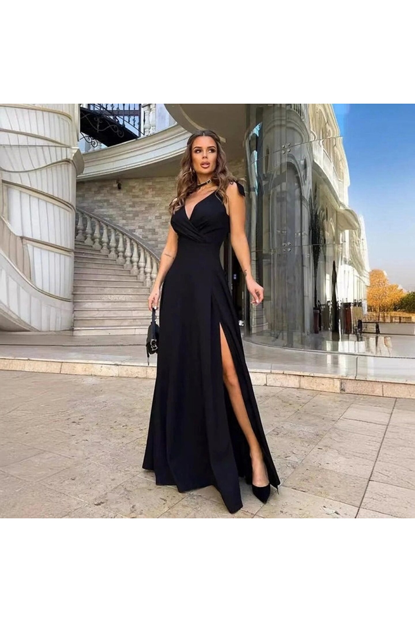 MissRunin Kadın Askılı Omuzdan Bağlamalı Kruvaze Yakalı Uzun Yırtmaçlı Janjan Krep Elbise