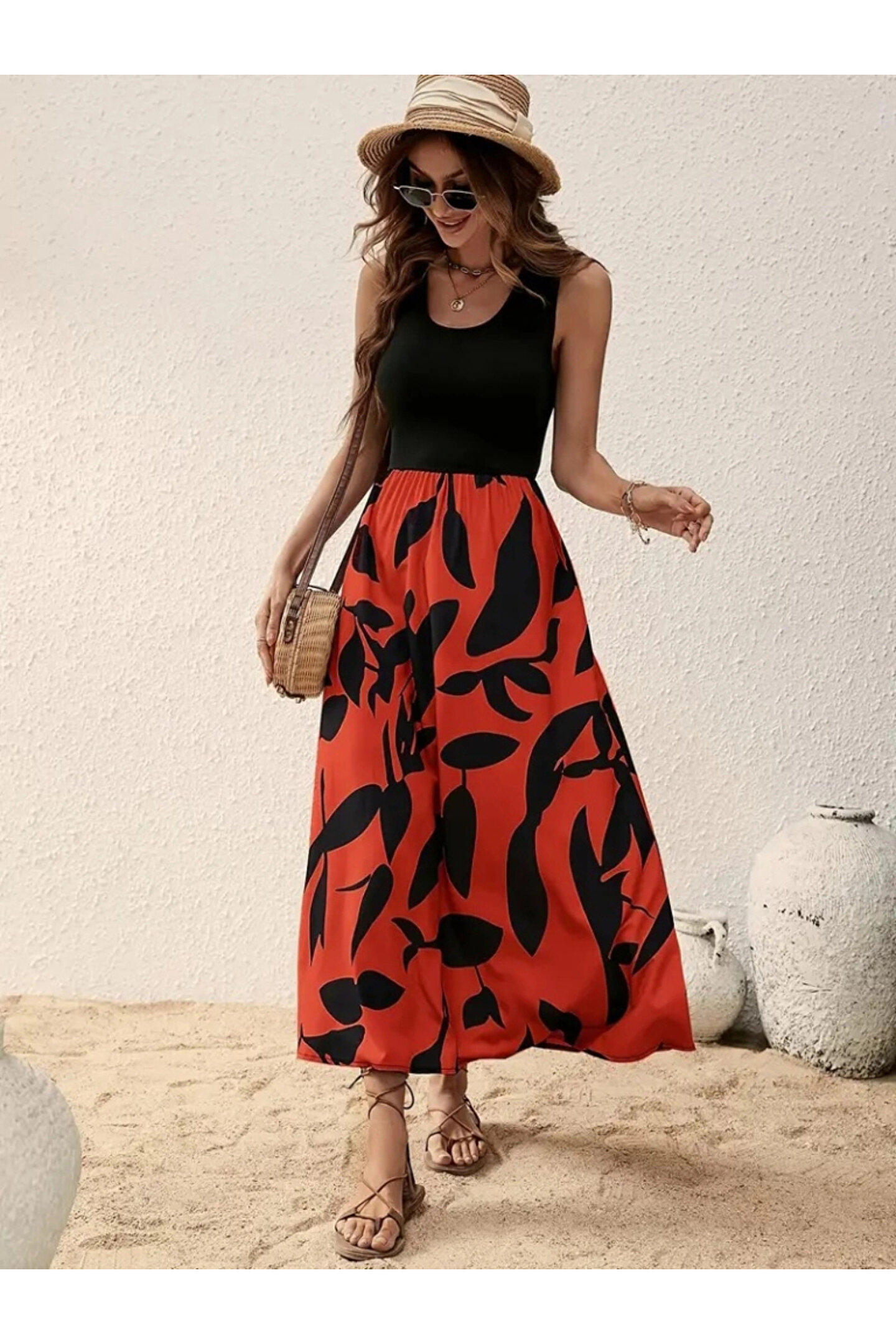 MissRunin Kadın Askılı Yuvarlak Yaka üst Viskon Alt Desenli Uzun Süprem Elbise