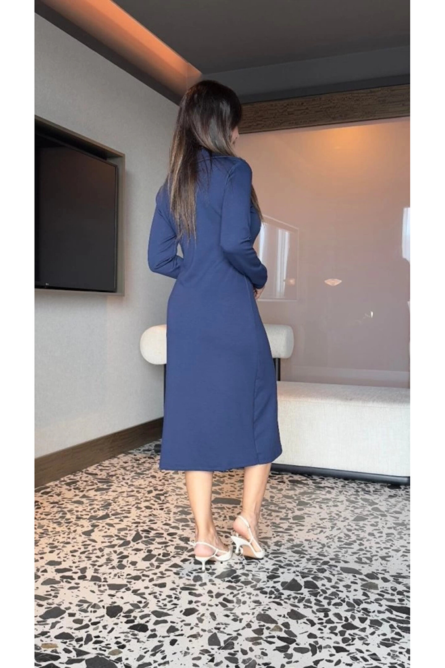 MissRunin Kadın Uzun Kollu Balıkçı Yaka önden Fermuarlı Yırtmaçlı Midi Viskon Iki Iplik Elbise