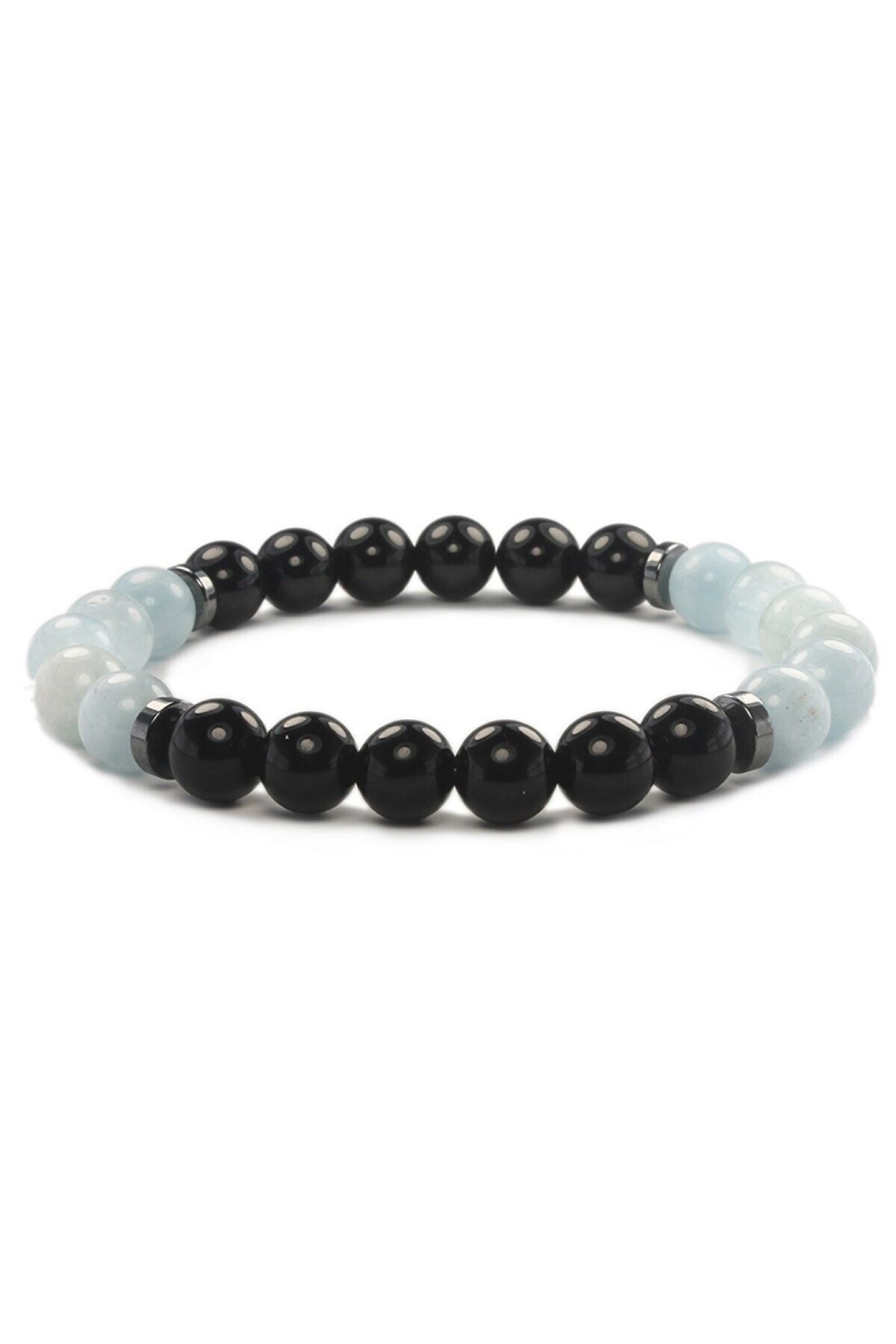 Bu zarif bileklik, doğanın güzelliğini parmaklarınıza taşıyan bir mücevherdir; Aquamarin ve obsidyen taşların eşsiz uyumu ile tasarlanmıştır ve her tür kıyafetle kolayca uyum sağlar; 8 mm kalınlığındaki doğal taş boncukları, hem rahatlık hem de estetik bir görünüm sunar; Bu bileklik, günlük kullanım için idealdir ve her zaman şık görünmenizi sağlar; ;;