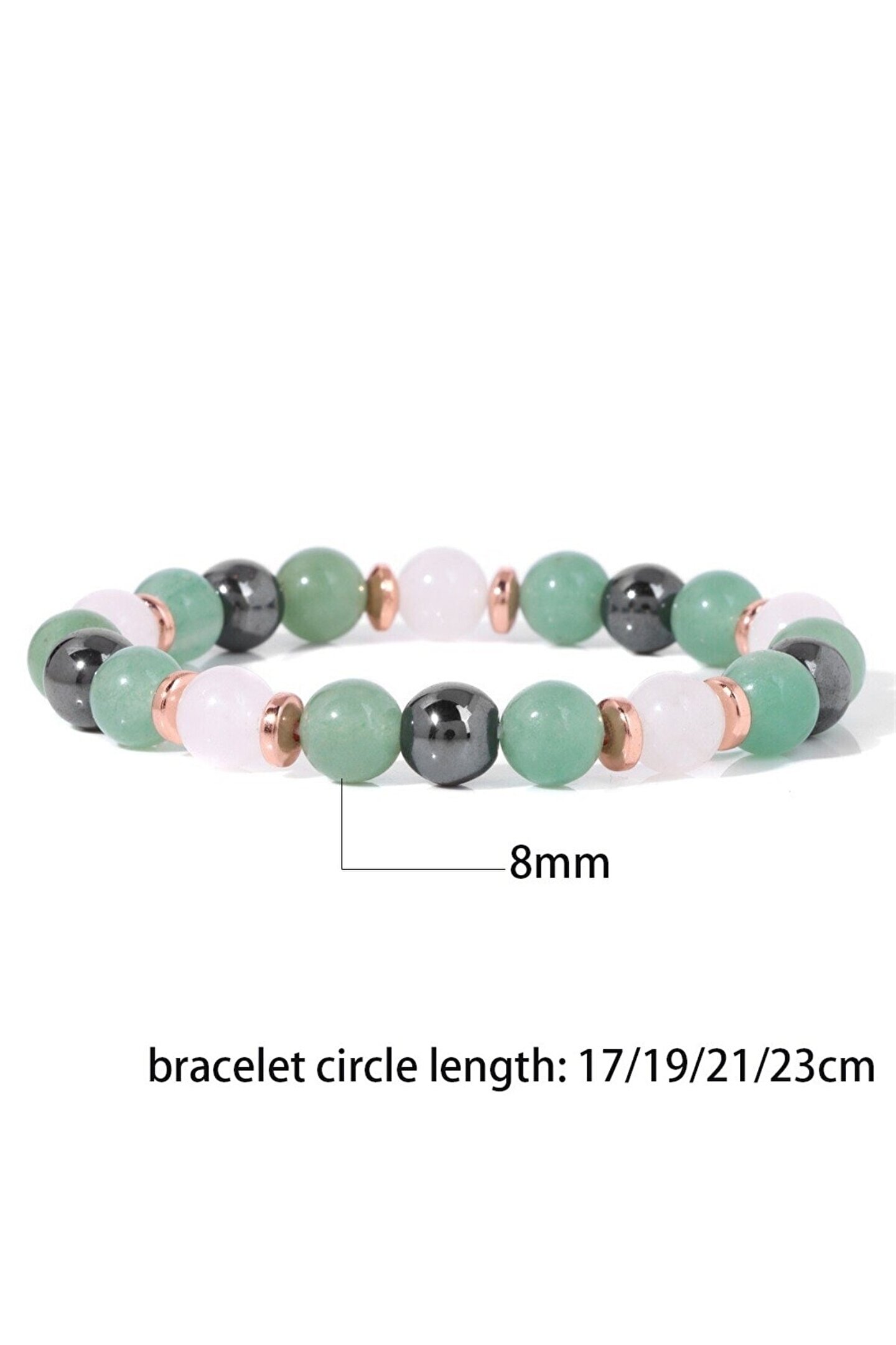 - Doğal taş bileklik, şıklığınızı tamamlayacak zarif bir aksesuardır; - Aventurin, pembe kuvars ve hematit gibi doğal taşların eşsiz renk ve desenleriyle göz alıcı bir görünüm sunar; - 8mm boyutundaki bu bileklik, hem günlük kullanım hem de özel günler için idealdir; - Doğal taş materyali sayesinde her parça benzersizdir ve doğanın güzelliklerini bileğinizde taşımanızı sağlar;