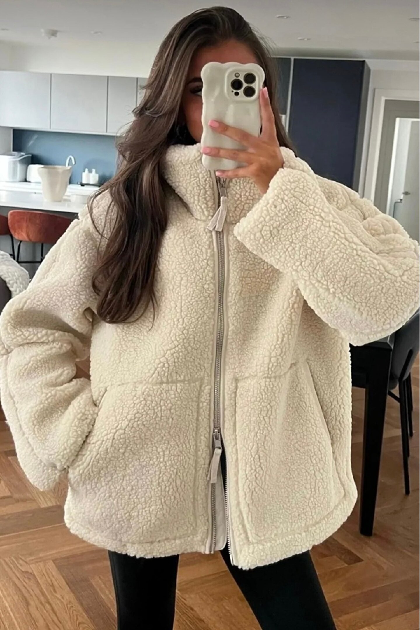 moda armanc Bej Dik Yakalı Cepli Kadın Peluş Mont