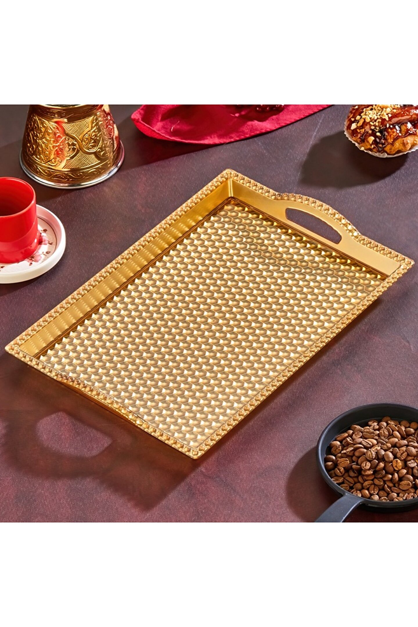 • - Altın rengi bal peteği deseniyle şıklığı ve zarafeti evinize taşıyan sunum tepsisi.