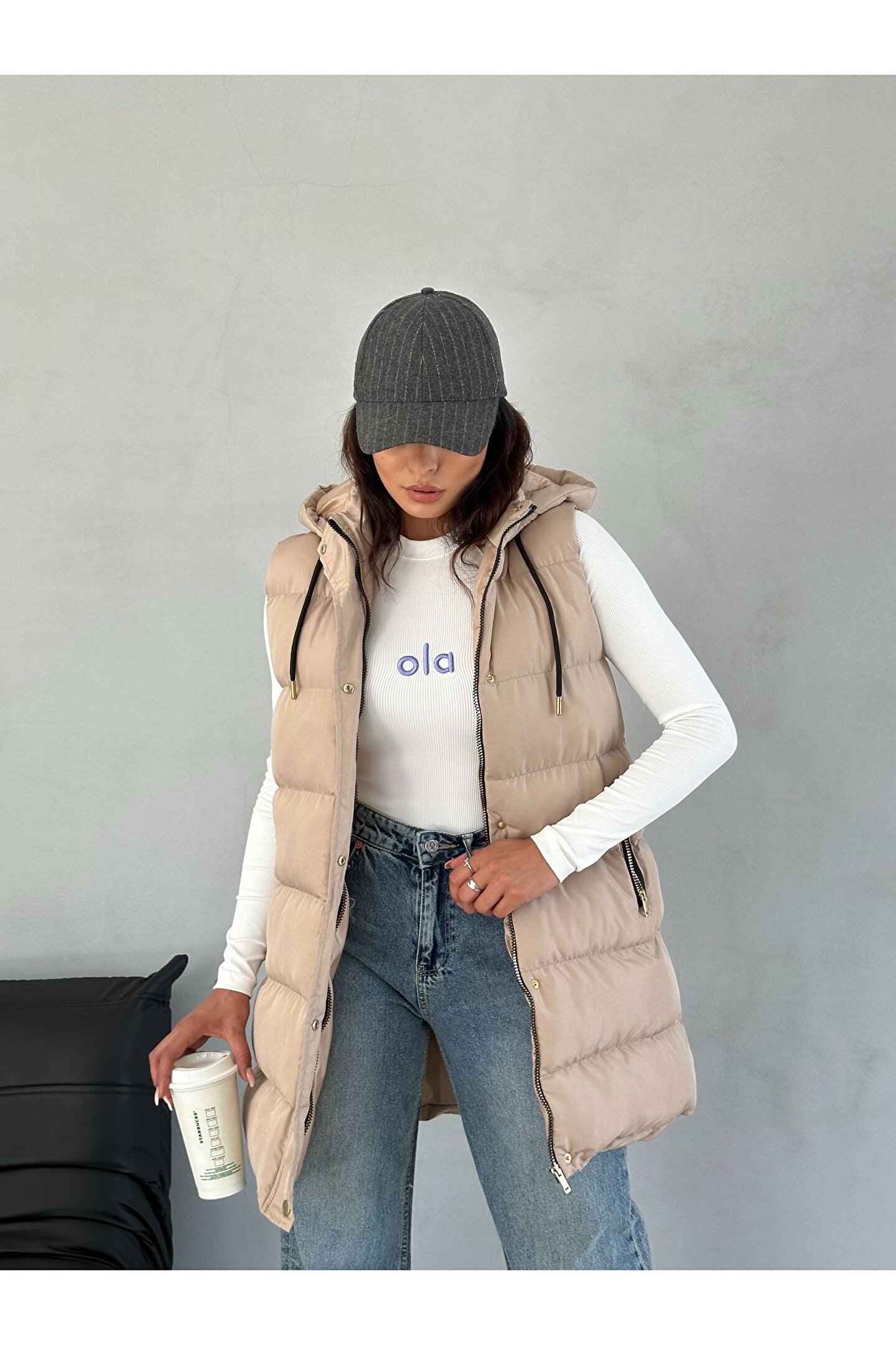 Gold Detaylı Kapüşonlu Uzun Bej Şişme Yelek