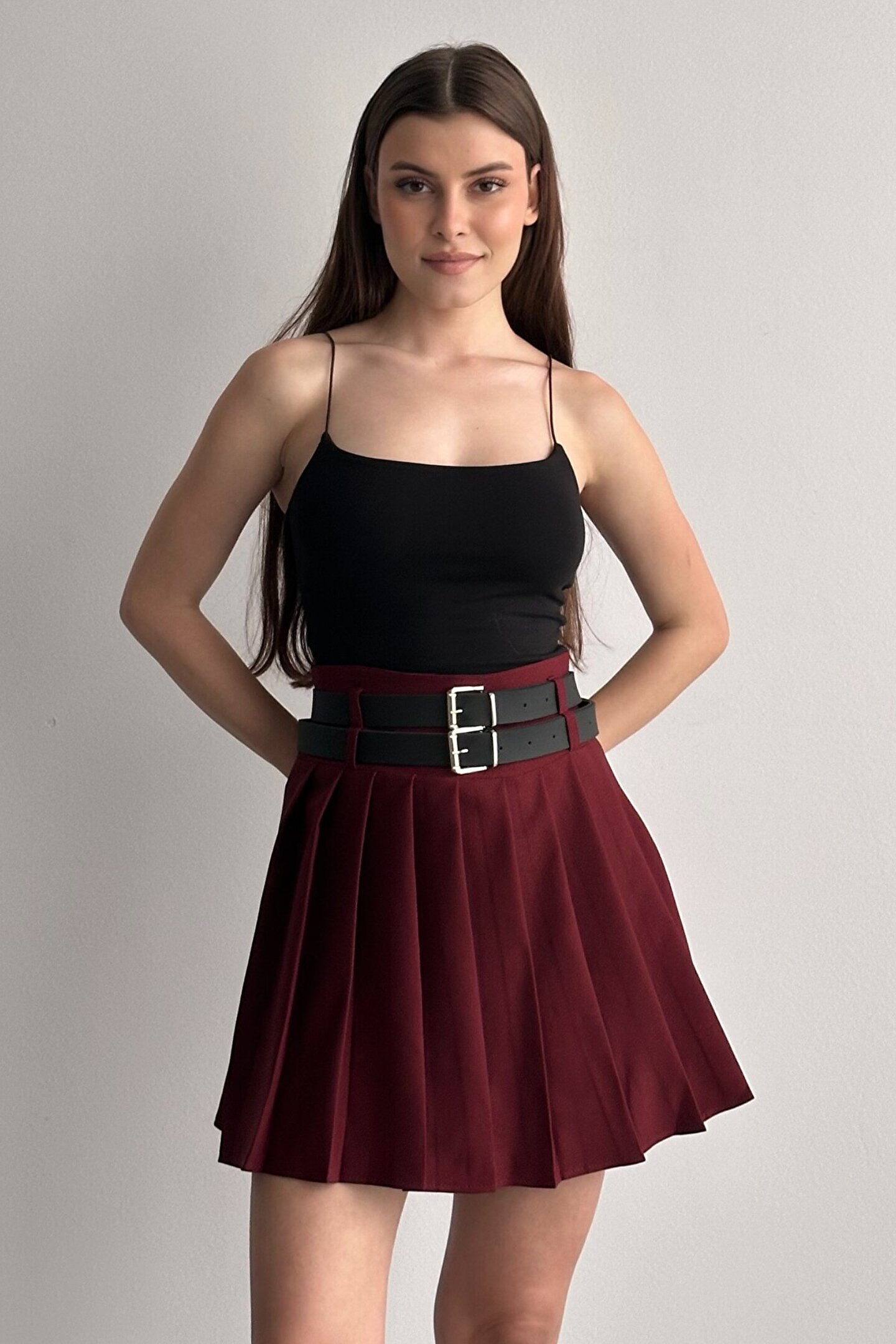 Çift kemer detayıyla öne çıkan yüksek bel pileli mini etek, günlük kombinlerin vazgeçilmez tamamlayıcı parçasıdır.; ; Modern ve güçlü stilin en iddialı parçalarından biri olan çift kemer detaylı pileli mini etek, günlük kombinlerden şehir stiline kadar birçok kullanım alanı sunar.; ; Yüksek bel tasarımı vücut formunu dengelerken pileli yapısı hareketli ve zarif bir görünüm kazandırır.; ; Bel kısmında yer alan çift kemer detayı ürüne karakter kazandırırken, kombinlerin odak noktası olmasını sağlar.; ; Günlük kullanımda basic tişört, crop, gömlek ve blazer ceketlerle rahatlıkla tamamlanabilir.; ; Akıcı formu sayesinde yürüyüş sırasında doğal hareket sağlar ve gün boyu konforlu kullanım sunar.; ; Hem spor hem şık kombinlere uyum sağlayabilen zamansız bir tasarımdır.; ; Yüksek bel form ; Çift kemer detay tasarım ; Pileli mini etek kesimi ; Günlük ve şehir stiline uygun ; Kombin tamamlayıcı modern görünüm ; Gardırobun kurtarıcı parçalarından biri olacak bu model, stiline güçlü ve dikkat çekici bir dokunuş katmak isteyen kadınlar için tasarlanmıştır.; ; Manken Ölçüleri: Boy:1.70cm Kilo:58kg (Üzerindeki ürün S bedendir);