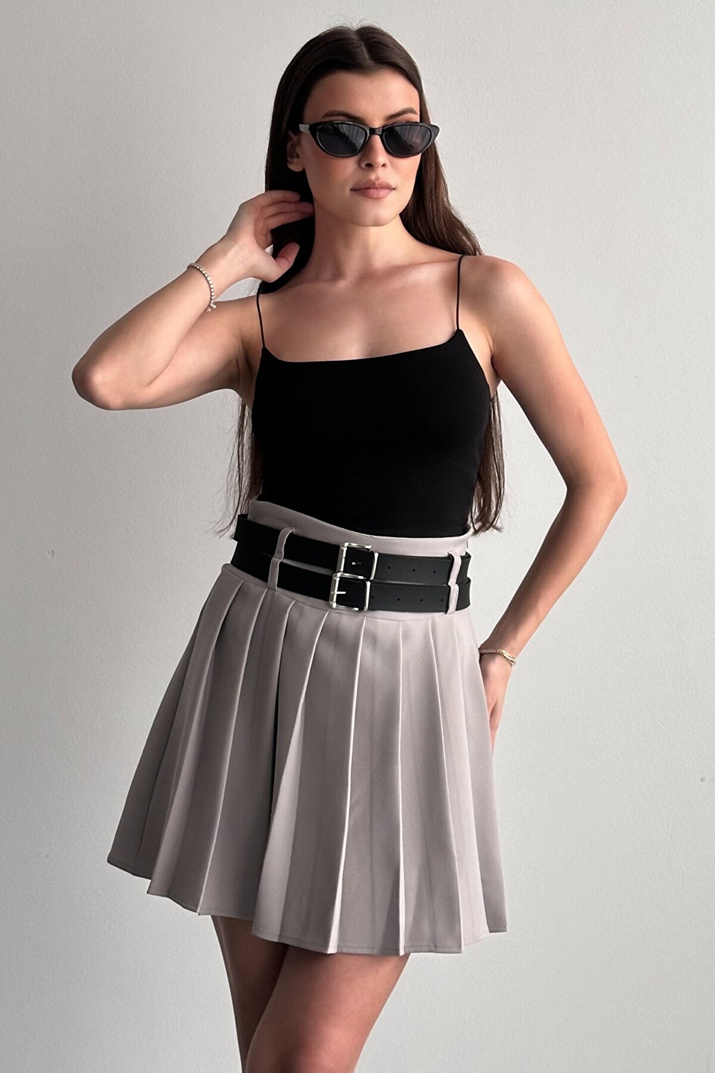 Çift kemer detayıyla öne çıkan yüksek bel pileli mini etek, günlük kombinlerin vazgeçilmez tamamlayıcı parçasıdır.; ; Modern ve güçlü stilin en iddialı parçalarından biri olan çift kemer detaylı pileli mini etek, günlük kombinlerden şehir stiline kadar birçok kullanım alanı sunar.; ; Yüksek bel tasarımı vücut formunu dengelerken pileli yapısı hareketli ve zarif bir görünüm kazandırır.; ; Bel kısmında yer alan çift kemer detayı ürüne karakter kazandırırken, kombinlerin odak noktası olmasını sağlar.; ; Günlük kullanımda basic tişört, crop, gömlek ve blazer ceketlerle rahatlıkla tamamlanabilir.; ; Akıcı formu sayesinde yürüyüş sırasında doğal hareket sağlar ve gün boyu konforlu kullanım sunar.; ; Hem spor hem şık kombinlere uyum sağlayabilen zamansız bir tasarımdır.; ; Yüksek bel form ; Çift kemer detay tasarım ; Pileli mini etek kesimi ; Günlük ve şehir stiline uygun ; Kombin tamamlayıcı modern görünüm ; Gardırobun kurtarıcı parçalarından biri olacak bu model, stiline güçlü ve dikkat çekici bir dokunuş katmak isteyen kadınlar için tasarlanmıştır.; ; Manken Ölçüleri: Boy:1.70cm Kilo:58kg (Üzerindeki ürün S bedendir);