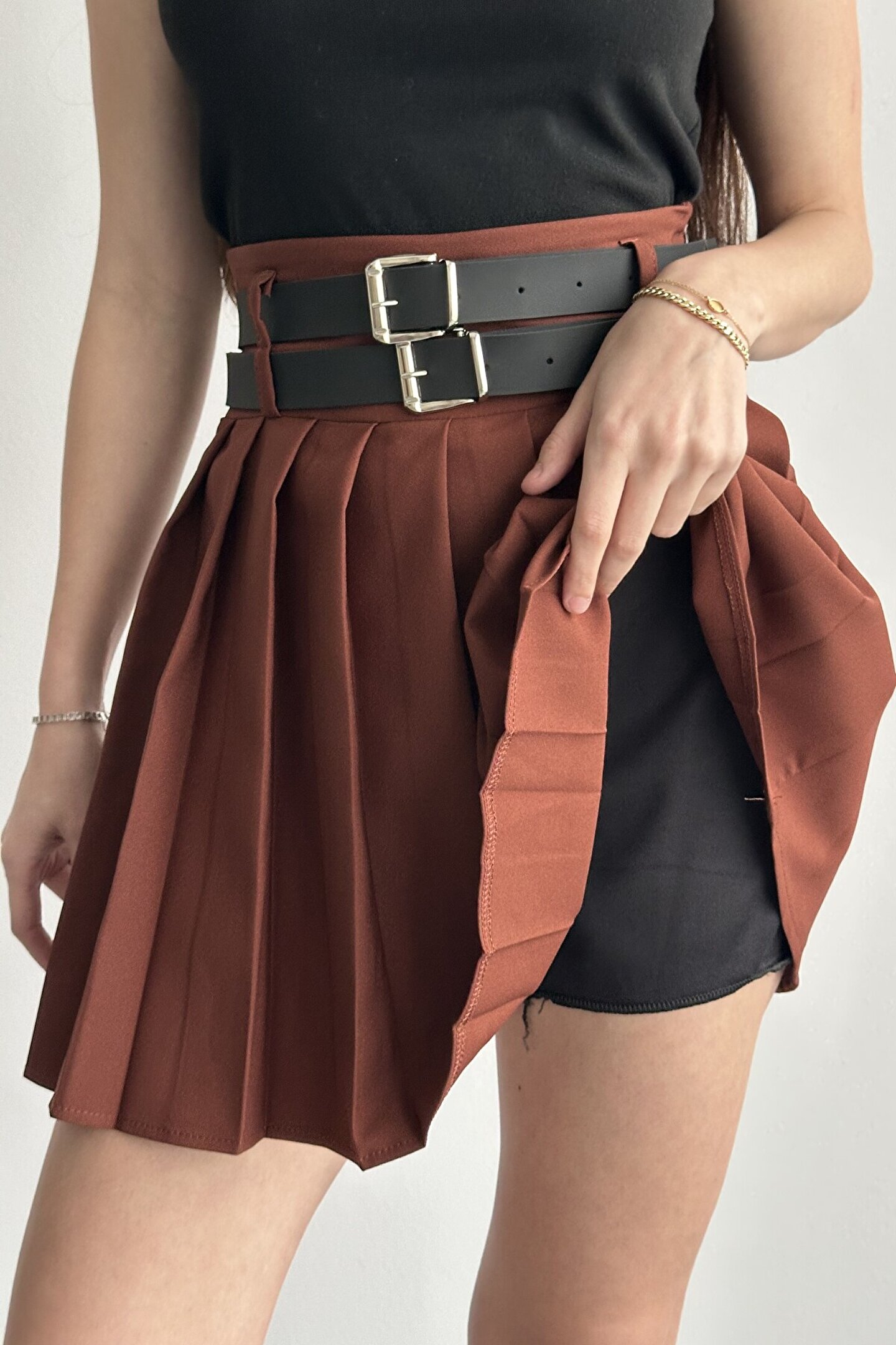 Çift kemer detayıyla öne çıkan yüksek bel pileli mini etek, günlük kombinlerin vazgeçilmez tamamlayıcı parçasıdır.; ; Modern ve güçlü stilin en iddialı parçalarından biri olan çift kemer detaylı pileli mini etek, günlük kombinlerden şehir stiline kadar birçok kullanım alanı sunar.; ; Yüksek bel tasarımı vücut formunu dengelerken pileli yapısı hareketli ve zarif bir görünüm kazandırır.; ; Bel kısmında yer alan çift kemer detayı ürüne karakter kazandırırken, kombinlerin odak noktası olmasını sağlar.; ; Günlük kullanımda basic tişört, crop, gömlek ve blazer ceketlerle rahatlıkla tamamlanabilir.; ; Akıcı formu sayesinde yürüyüş sırasında doğal hareket sağlar ve gün boyu konforlu kullanım sunar.; ; Hem spor hem şık kombinlere uyum sağlayabilen zamansız bir tasarımdır.; ; Yüksek bel form ; Çift kemer detay tasarım ; Pileli mini etek kesimi ; Günlük ve şehir stiline uygun ; Kombin tamamlayıcı modern görünüm ; Gardırobun kurtarıcı parçalarından biri olacak bu model, stiline güçlü ve dikkat çekici bir dokunuş katmak isteyen kadınlar için tasarlanmıştır.; ; Manken Ölçüleri: Boy:1.70cm Kilo:58kg (Üzerindeki ürün S bedendir);